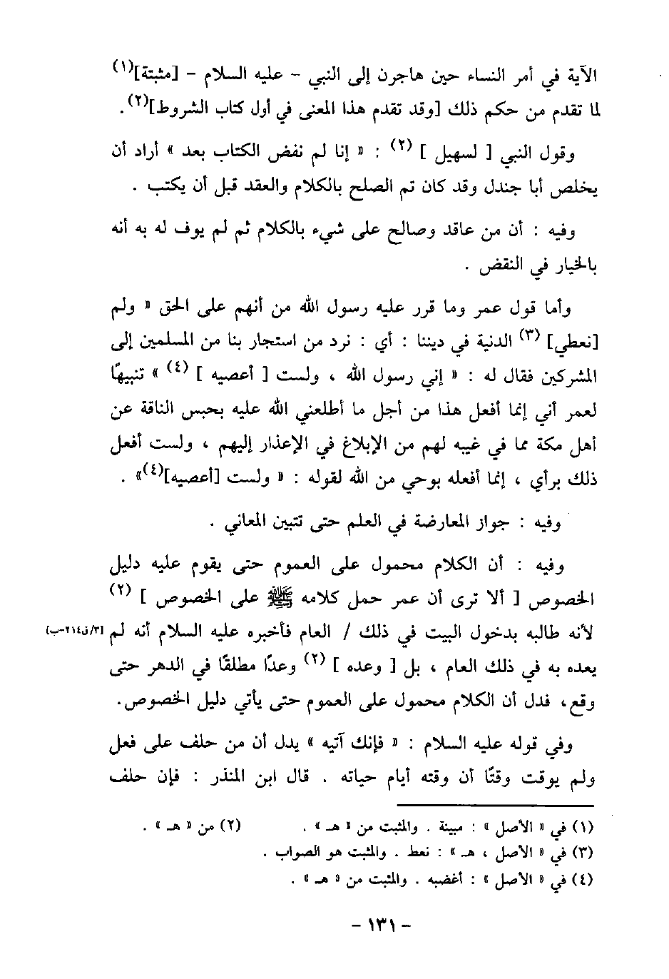 الآية فى أمر النساء حين هاجرن إلى النبى (صلى الله عليه وسلم) مثبتة لما تقدم من حكم ذلك وقد تقدم هذا المعنى فى أول كتاب الشروط. وقول النبى (صلى الله عليه وسلم) لسهيل: (إنا لم نفض الكتاب بعد) أراد أن يخلص أبا جندل وقد كان تم الصلح بالكلام والعقد قبل أن يكتب. وفيه: أن من عاقد وصالح على شىء بالكلام ثم لم يوف له به أنه بالخيار فى النقض. وأما قول عمر وما قرر عليه رسول الله (صلى الله عليه وسلم) من أنهم على الحق (ولم نعطى الدنية فى ديننا) ، أى نرد من استجار بنا من المسلمين إلى المشركين فقال له: (إنى رسول الله (صلى الله عليه وسلم) ، ولست أعصيه) تنبيهًا لعمر أنى إنما أفعل هذا من أجل ما أطلعنى الله عليه بحبس الناقة عن أهل مكة مما فى غيبه لهم من الإبلاغ فى الإعذار إليهم، ولست أفعل ذلك برأى، إنما أفعله بوحى من الله لقوله: (ولست أعصيه) . وفيه: جواز المعارضة فى العلم حتى تتبين المعانى. وفيه: أن الكلام محمول على العموم حتى يقوم عليه دليل الخصوص ألا ترى أن عمر حمل كلامه (صلى الله عليه وسلم) على الخصوص لأنه طالبه بدخول البيت فى ذلك العام فأخبره (صلى الله عليه وسلم) أنه لم يعده به فى ذلك العام، بل وعده وعدًا مطلقًا فى الدهر حتى وقع، فدل أن الكلام محمول على العموم حتى يأتى دليل الخصوص. وفى قوله (صلى الله عليه وسلم) : (فإنك آتيه) يدل أن من حلف على فعل ولم يوقت وقتًا أن وقته أيام حياته. قال ابن المنذر: فإن حلف