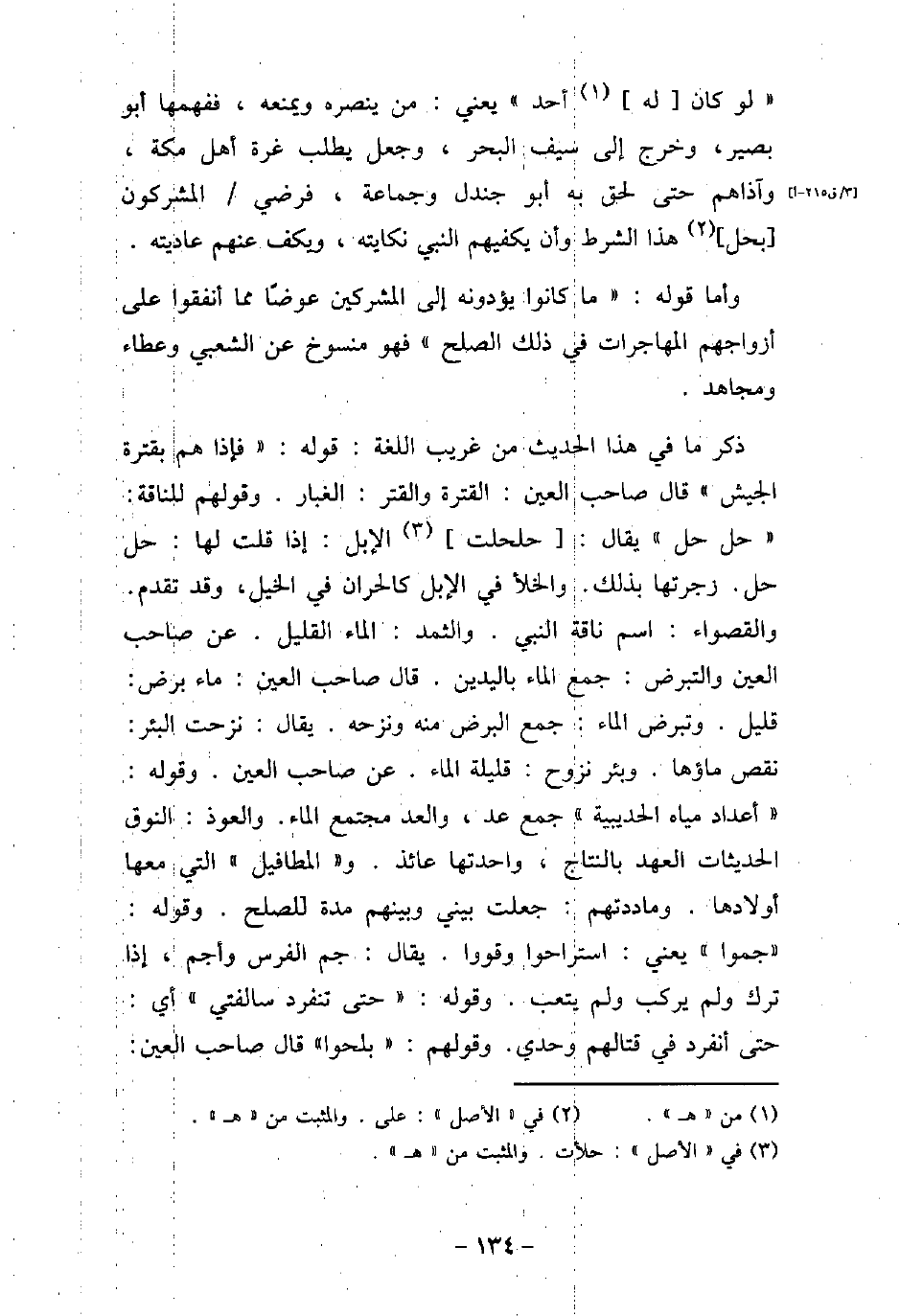 (لو كان له أحد) يعنى: من ينصره ويمنعه، ففهمها أبو بصير، وخرج إلى سيف البحر، وجعل يطلب غرة أهل مكة، وآذاهم حتى لحق به أبو جندل وجماعة، فرضى المشركون بحل هذا الشرط وأن يكفيهم النبى (صلى الله عليه وسلم) نكايته، ويكف عنهم عاديته. وأما قوله: (ما كانوا يؤدونه إلى المشركين عوضًا مما أنفقوا على أزواجهم المهاجرات فى ذلك الصلح) فهو منسوخ عن الشعبى وعطاء ومجاهد. ذكر ما فى هذا الحديث من غريب اللغة: قوله: (فإذا هم بقترة الجيش) قال صاحب العين: القترة والقتر: الغبار. وقولهم للناقة: (حل حل) يقال: حلحلت الإبل: إذا قلت لها: حل حل. زجرتها بذلك. والخلأ فى الإبل كالحران فى الخيل، وقد تقدم. والقصواء: اسم ناقة النبى (صلى الله عليه وسلم) . والثمد: الماء القليل. عن صاحب العين والتبرض: جمع الماء باليدين. قال صاحب العين: ماء برض: قليل. وتبرض الماء: جمع البرض منه ونزحه. يقال: نزحت البئر: نقص ماؤها. وبئر نزوح: قليلة الماء. عن صاحب العين. وقوله: (أعداد مياة الحديبية) جمع عد، والعد مجتمع الماء. والعوذ: النوق الحديثات العهد بالنتاج، واحدتها عائذ. و (المطافيل) التى معها أولادها. وماددتهم: جعلت بينى وبينهم مدة للصلح. وقوله: (جمعوا) يعنى: استراحوا وقووا. يقال: جم الفرس وأجم، إذا ترك ولم يركب ولم يتعب. وقوله: (حتى تنفرد سالفتى) أى: حتى أنفرد فى قتالهم وحدى. وقولهم: (بلحوا) قال صاحب العين:
