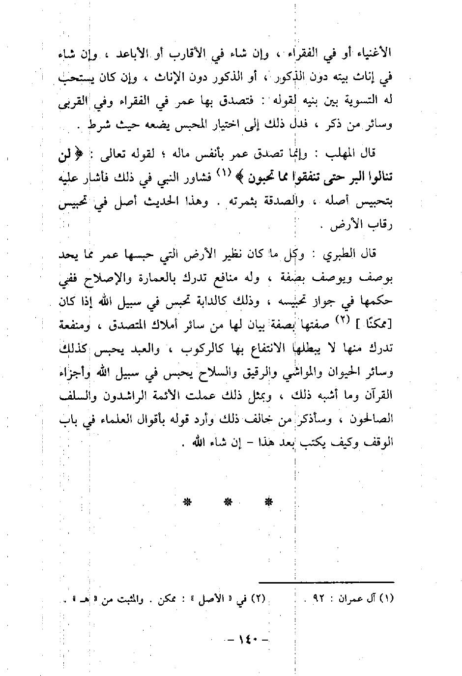 الأغنياء أو فى الفقراء، وإن شاء فى الأقارب أو الأباعد، وإن شاء فى إناث بيته دون الذكور، أو الذكور دون الإناث، وإن كان يستحب له التسوية بين بنيه لقوله: فتصدق بها عمر فى الفقراء وفى القربى وسائر من ذكر، فدل ذلك إلى اختيار المحبس يضعه حيث شرط. قال المهلب: وإنما تصدق عمر لأنفس ماله؛ لقوله تعالى: (لن تنالوا البر حتى تنفقوا مما تحبون) [آل عمران: 92] فشاور النبى (صلى الله عليه وسلم) فى ذلك فأشار عليه بتحبيس أصله، والصدقة بثمرته. وهذا الحديث أصل فى تحبيس رقاب الأرض. قال الطبرى: وكل ما كان نظير الأرض التى حبسها عمر مما يحد بوصف ويوصف بصفة، وله منافع تدرك بالعمارة، والإصلاح ففى حكمها فى جواز تحبيسه، وذلك كالدابة تحبس فى سبيل الله إذا كان ممكنًا صفتها بصفة بيان لها من سائر أملاك المتصدق، ومنفعة تدرك منها لا يبطلها الانتفاع بها كالركوب، والعبد يحبس كذلك وسائر الحيوان والمواشى والرقيق والسلاح يحبس فى سبيل الله وأجزاء القرآن وما أشبه ذلك، وبمثل ذلك عملت الأئمة الراشدون والسلف الصالحون، وسأذكر من خالف ذلك وأرد قوله بأقوال العلماء فى باب الوقف وكيف يكتب بعد هذا إن شاء الله.