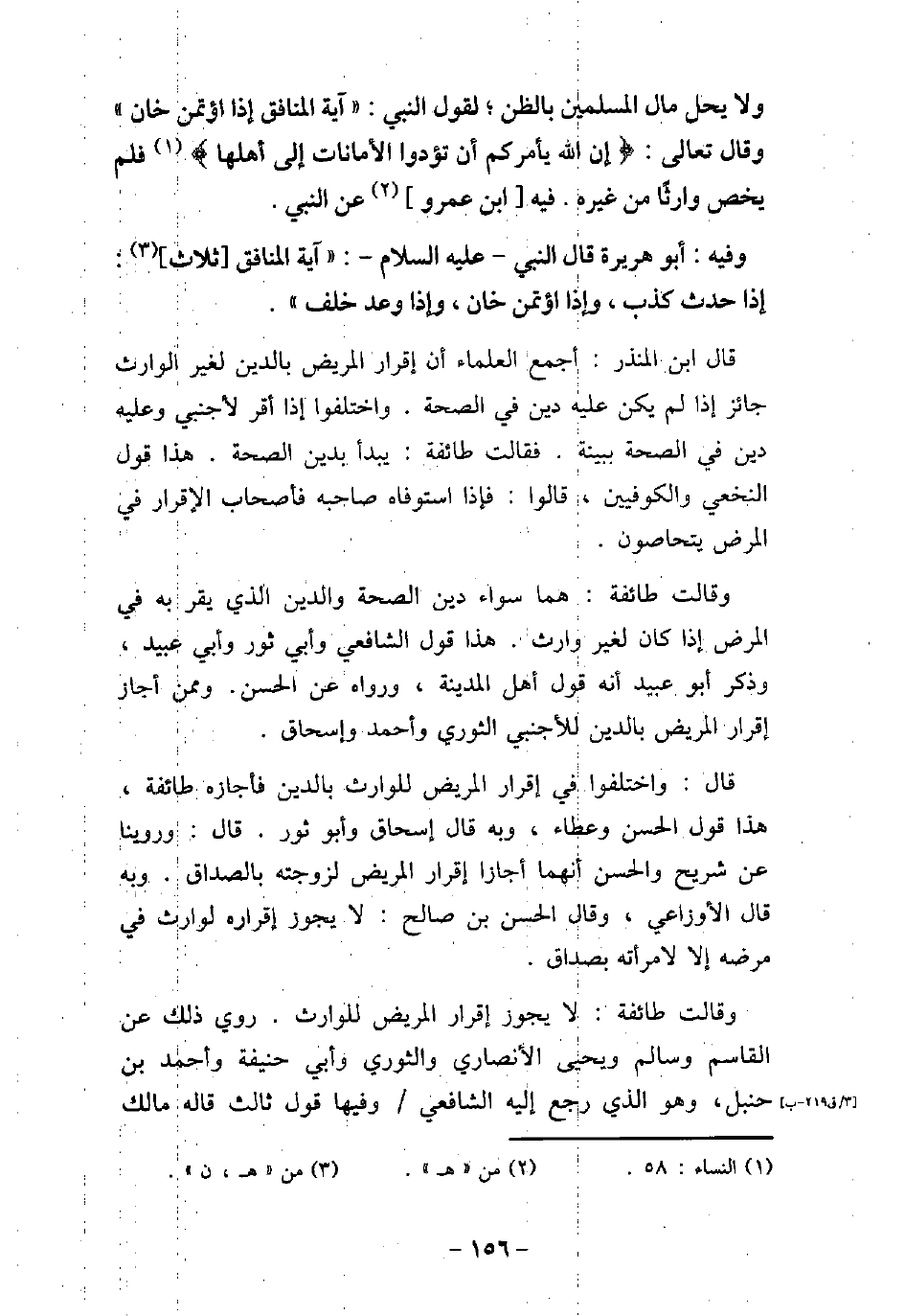 وَلا يَحِلُّ مَالُ الْمُسْلِمِينَ لِقَوْلِ النَّبِىِّ (صلى الله عليه وسلم) : آيَةُ الْمُنَافِقِ إِذَا اؤْتُمِنَ خَانَ، وَقَالَ تَعَالَى: (إِنَّ اللَّهَ يَأْمُرُكُمْ أَنْ تُؤَدُّوا الأمَانَاتِ إِلَى أَهْلِهَا) [النساء: 58] فَلَمْ يَخُصَّ وَارِثًا وَلا غَيْرَهُ. فِيهِ ابْنُ عَمْرٍو، عَنِ النَّبِىِّ (صلى الله عليه وسلم) . / 12 - وفيه: أَبُو هُرَيْرَةَ قَالَ النَّبِىِّ (صلى الله عليه وسلم) : (آيَةُ الْمُنَافِقِ ثَلاثٌ: إِذَا حَدَّثَ كَذَبَ، وَإِذَا اؤْتُمِنَ خَانَ، وَإِذَا وَعَدَ أَخْلَفَ) . قال ابن المنذر: أجمع العلماء أن إقرار المريض بالدين لغير الوارث جائز إذا لم يكن عليه دين فى الصحة. واختلفوا إذا أقر لأجنبى وعليه دين فى الصحة ببينة. فقالت طائفة: يبدأ بدين الصحة. هذا قول النخعى والكوفيين، قالوا: فإذا استوفاه صاحبه فأصحاب الإقرار فى المرض يتحاصون. وقالت طائفة: هما سواء دين الصحة والدين الذى يقر به فى المرض إذا كان لغير وارث. هذا قول الشافعى وأبى ثور وأبى عبيد، وذكر أبو عبيد أنه قول أهل المدينة، ورواه عن الحسن. وممن أجاز إقرار المريض بالدين للأجنبى الثورى وأحمد وإسحاق. قال: واختلفوا فى إقرار المريض للوارث بالدين فأجازه طائفة، هذا قول الحسن وعطاء، وبه قال إسحاق وأبو ثور. قال: وروينا عن شريح والحسن أنهما أجازا إقرار المريض لزوجته بالصداق. وبه قال الأوزاعى، وقال الحسن بن صالح: لا يجوز إقراره لوارث فى مرضه إلا لامرأته بصداق. وقالت طائفة: لا يجوز إقرار المريض للوارث. روى ذلك عن القاسم وسالم ويحيى الأنصارى والثورى وأبى حنيفة وأحمد بن حنبل، وهو الذى رجع إليه الشافعى وفيها قول ثالث قاله مالك