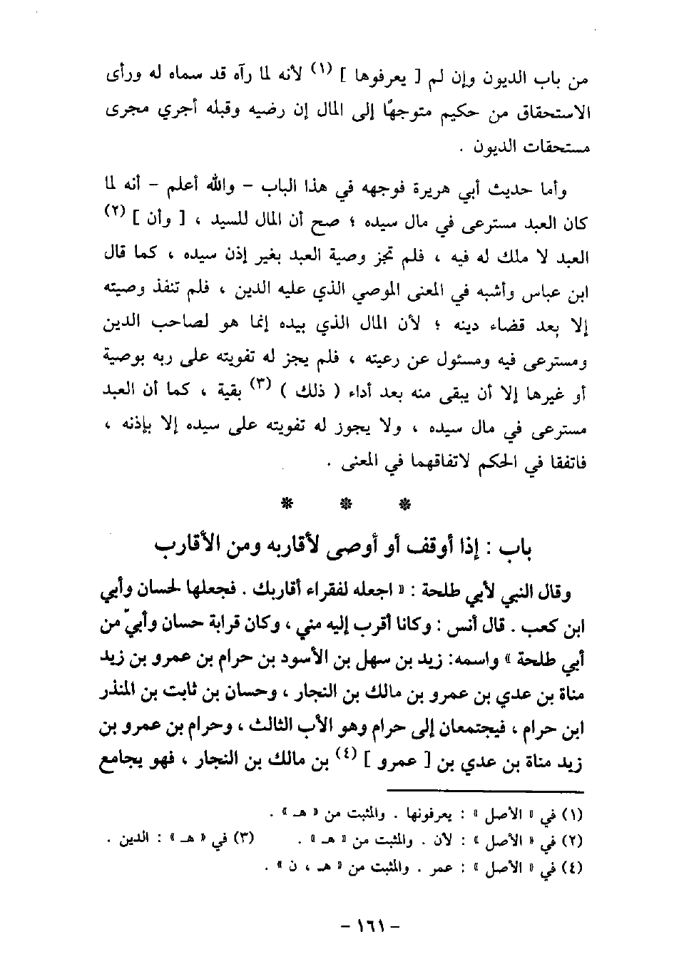 وَقَالَ النَّبِىُّ (صلى الله عليه وسلم) لأبِى طَلْحَةَ: (اجْعَلْهَا لِفُقَرَاءِ أَقَارِبِكَ) ، فَجَعَلَهَا لِحَسَّانَ، وَأُبَىِّ بْنِ كَعْبٍ، وَقَالَ الأنْصَارِىُّ: حَدَّثَنِى أَبِى، عَنْ ثُمَامَةَ، عَنْ أَنَسٍ مِثْلَ حَدِيثِ ثَابِتٍ، قَالَ: (اجْعَلْهَا لِفُقَرَاءِ قَرَابَتِكَ) ، قَالَ أَنَسٌ: فَجَعَلَهَا لِحَسَّانَ، وَأُبَىِّ بْنِ كَعْبٍ، وَكَانَا أَقْرَبَ إِلَيْهِ مِنِّى، وَكَانَ قَرَابَةُ حَسَّانٍ وَأُبَىٍّ، مِنْ أَبِى طَلْحَةَ، وَاسْمُهُ: زَيْدُ بْنُ سَهْلِ بْنِ الأسْوَدِ بْنِ حَرَامِ بْنِ عَمْرِو بْنِ زَيْدِ مَنَاةَ بْنِ عَدِىِّ بْنِ عَمْرِو بْنِ مَالِكِ بْنِ النَّجَّارِ، وَحَسَّانُ بْنُ ثَابِتِ بْنِ المُنْذِرِ بْنِ حَرَامٍ، فَيَجْتَمِعَانِ إِلَى حَرَامٍ، وَهُوَ الأبُ الثَّالِثُ، وَحَرَامُ بْنُ عَمْرِو بْنِ زَيْدِ مَنَاةَ بْنِ عَدِىِّ بْنِ عَمْرِو ابْنِ مَالِكِ بْنِ النَّجَّارِ، فَهُوَ يُجَامِعُ