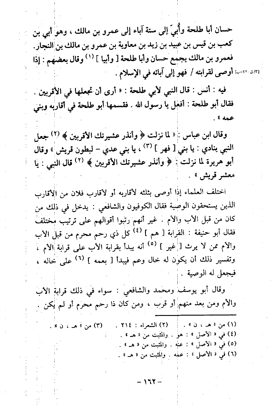 حَسَّانَ وَأَبَا طَلْحَةَ وَأُبَيًّا إِلَى سِتَّةِ آبَاءٍ إِلَى عَمْرِو بْنِ مَالِكٍ، وَهُوَ أُبَىُّ بْنُ كَعْبِ بْنِ قَيْسِ بْنِ عُبَيْدِ بْنِ زَيدِ بْنِ مُعَاوِيَةَ بْنِ عَمْرِو بْنِ مَالِكِ بْنِ النَّجَّارِ، فَعَمْرُو بْنُ مَالِكٍ يَجْمَعُ حَسَّانَ وَأَبَا طَلْحَةَ وَأُبَيًّا، وَقَالَ بَعْضُهُمْ: إِذَا أَوْصَى لِقَرَابَتِهِ فَهُوَ إِلَى آبَائِهِ فِى الإسْلامِ. / 15 - فيه: أَنَس قَالَ النَّبِىُّ (صلى الله عليه وسلم) لأبِى طَلْحَةَ: (أَرَى أَنْ تَجْعَلَهَا فِى الأقْرَبِينَ) ، قَالَ أَبُو طَلْحَةَ: أَفْعَلُ يَا رَسُولَ اللَّهِ، فَقَسَمَهَا أَبُو طَلْحَةَ فِى أَقَارِبِهِ وَبَنِى عَمِّهِ. وَقَالَ ابْنُ عَبَّاسٍ: لَمَّا نَزَلَتْ: (وَأَنْذِرْ عَشِيرَتَكَ الأقْرَبِينَ) [الشعراء: 214] جَعَلَ النَّبِىُّ (صلى الله عليه وسلم) يُنَادِى: (يَا بَنِى فِهْرٍ، يَا بَنِى عَدِىٍّ) ، لِبُطُونِ قُرَيْشٍ. وَقَالَ أَبُو هُرَيْرَةَ: لَمَّا نَزَلَتْ: (وَأَنْذِرْ عَشِيرَتَكَ الأقْرَبِينَ (قَالَ النَّبِىُّ (صلى الله عليه وسلم) : (يَا مَعْشَرَ قُرَيْشٍ) . اختلف العلماء إذا أوصى بثلثه لأقاربه أو لأقارب فلان من الأقارب الذين يستحقون الوصية فقال الكوفيون والشافعى: يدخل فى ذلك من كان من قبل الأب والأم. غير أنهم رتبوا أقوالهم على ترتيب مختلف فقال أبو حنيفة: القرابة هم كل ذى رحم محرم من قبل الأب والأم ممن لا يرث غير أنه يبدأ بقرابة الأب على قرابة الأم، وتفسير ذلك أن يكون له خال وعم فيبدأ بعمه على خاله، فيجعل له الوصية. وقال أبو يوسف، ومحمد، والشافعى: سواء فى ذلك قرابة الأب والأم ومن بعد منهم أو قرب، ومن كان ذا رحم محرم أو لم يكن.
