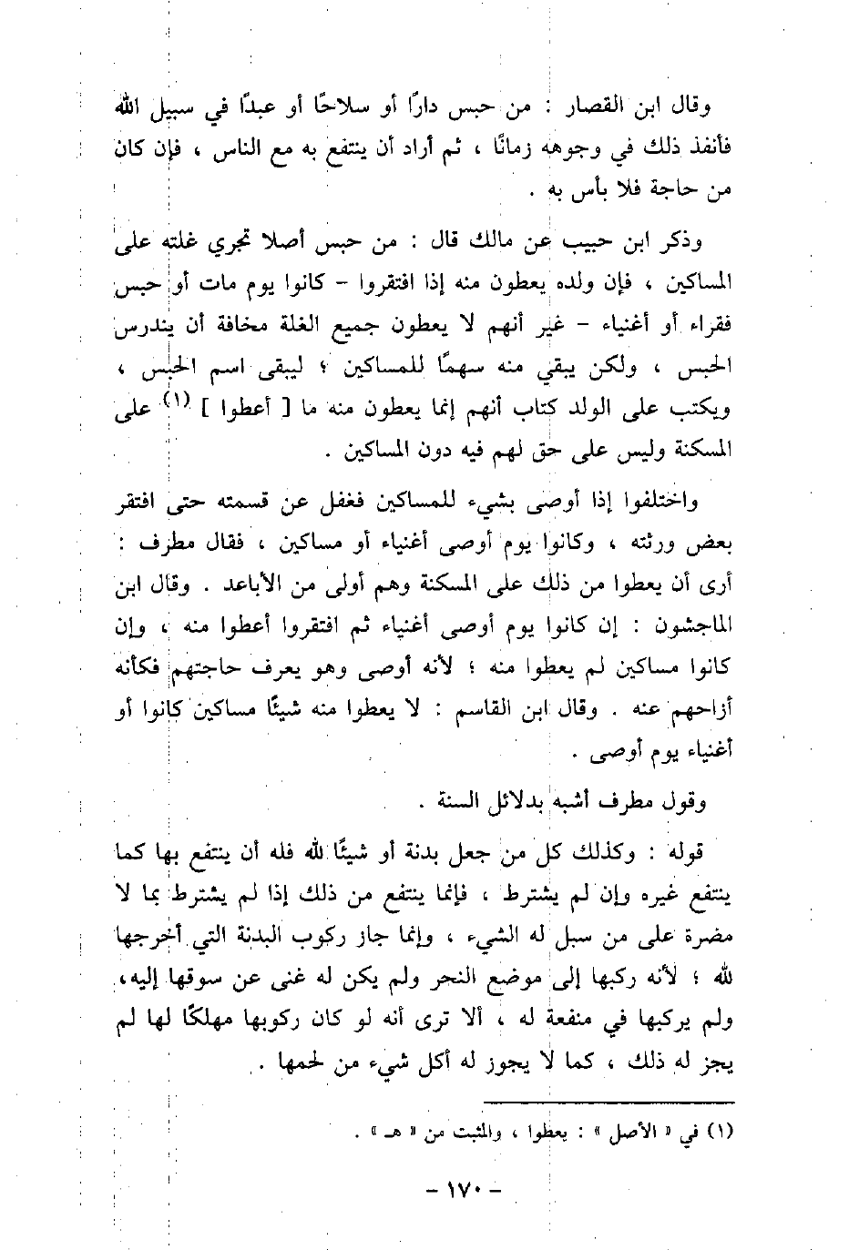 وقال ابن القصار: من حبس دارًا أو سلاحًا أو عبدًا فى سبيل الله فأنفذ ذلك فى وجوهه زمانًا، ثم أراد أن ينتفع به مع الناس، فإن كان من حاجة فلا بأس به. وذكر ابن حبيب عن مالك قال: من حبس أصلا تجرى غلته على المساكين، فإن ولده يعطون منه إذا افتقروا، كانوا يوم مات أو حبس فقراء أو أغنياء، غير أنهم لا يعطون جميع الغلة مخافة أن يندرس الحبس، ولكن يبقى منه سهمًا للمساكين؛ ليبقى اسم الحبس، ويكتب على الولد كتاب أنهم إنما يعطون منه ما أعطوا على المسكنة وليس على حق لهم فيه دون المساكين. واختلفوا إذا أوصى بشىء للمساكين فغفل عن قسمته حتى افتقر بعض ورثته، وكانوا يوم أوصى أغنياء أو مساكين، فقال مطرف: أرى أن يعطوا من ذلك على المسكنة وهم أولى من الأباعد. وقال ابن الماجشون: إن كانوا يوم أوصى أغنياء ثم افتقروا أعطوا منه، وإن كانوا مساكين لم يعطوا منه؛ لأنه أوصى وهو يعرف حاجتهم فكأنه أزاحهم عنه. وقال ابن القاسم: لا يعطوا منه شيئًا مساكين كانوا أو أغنياء يوم أوصى. وقول مطرف أشبه بدلائل السنة. قوله: وكذلك كل من جعل بدنة أو شيئًا لله فله أن ينتفع بها كما ينتفع غيره وإن لم يشترط، فإنما ينتفع من ذلك إذا لم يشترط بما لا مضرة على من سبل له الشىء، وإنما جاز ركوب البدنة التى أخرجها لله؛ لأنه ركبها إلى موضع النحر ولم يكن له غنى عن سوقها إليه، ولم يركبها فى منفعة له، ألا ترى أنه لو كان ركوبها مهلكًا لها لم يجز له ذلك، كما لا يجوز له أكل شىء من لحمها.