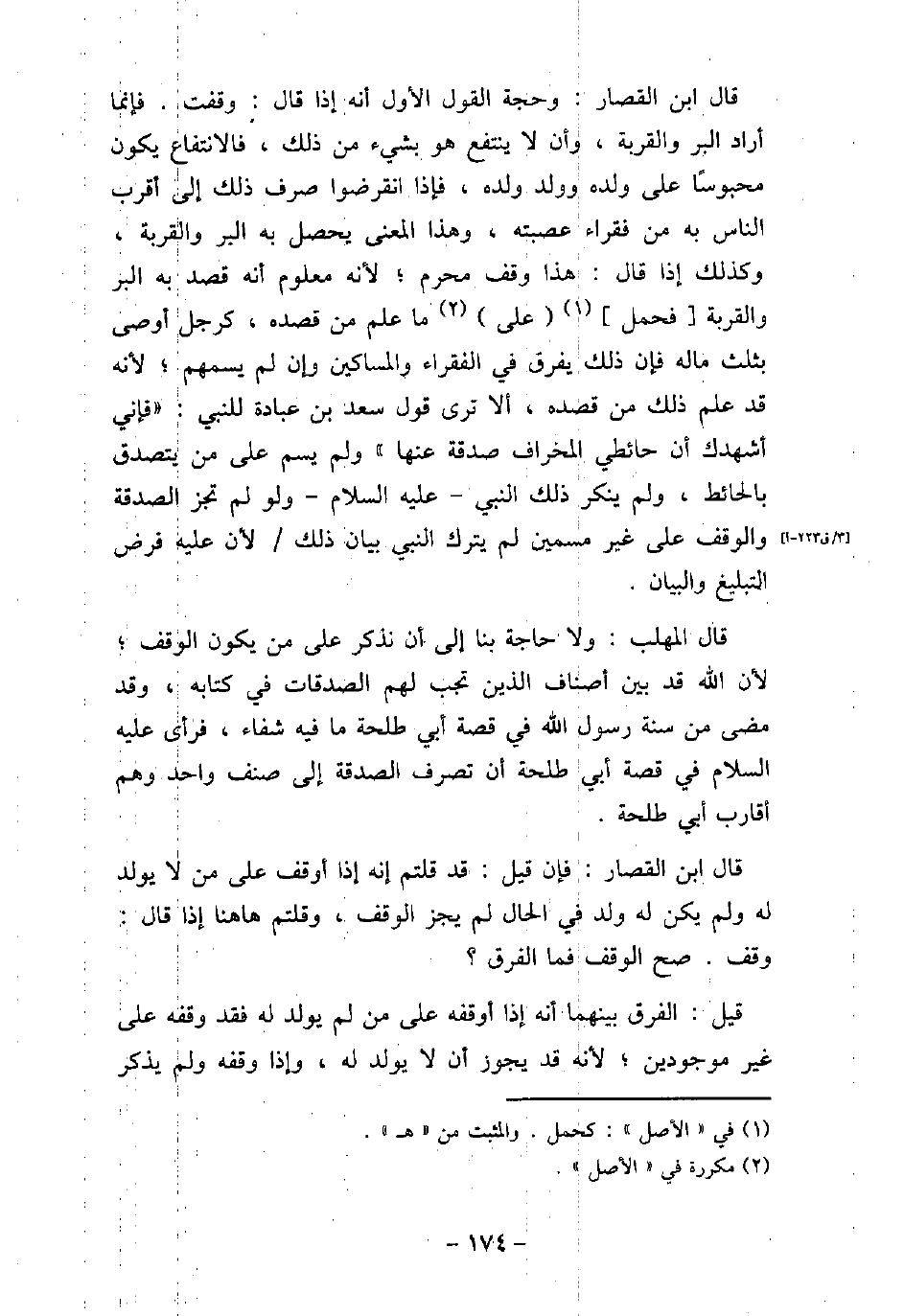 قال ابن القصار: وحجة القول الأول أنه إذا قال: وقفت. فإنما أراد البر والقربة، وأن لا ينتفع هو بشىء من ذلك، فالانتفاع يكون محبوسًا على ولده وولد ولده، فإذا انقرضوا صرف ذلك إلى أقرب الناس به من فقراء عصبته، وهذا المعنى يحصل به البر والقربة، وكذلك إذا قال: هذا وقف محرم؛ لأنه معلوم أنه قصد به البر والقربة فحمل على ما علم من قصده، كرجل أوصى بثلث ماله فإن ذلك يفرق فى الفقراء والمساكين وإن لم يسمهم؛ لأنه قد علم ذلك من قصده، ألا ترى قول سعد بن عبادة للنبى: (فإنى أشهدك أن حائطى المخراف صدقة عنها) ولم يسم على من يتصدق بالحائط، ولم ينكر ذلك النبى (صلى الله عليه وسلم) ولو لم تجز الصدقة والوقف على غير مسمين لم يترك النبى (صلى الله عليه وسلم) بيان ذلك لأن عليه فرض التبليغ والبيان. قال المهلب: ولا حاجة بنا إلى أن نذكر على من يكون الوقف؛ لأن الله قد بين أصناف الذين تجب لهم الصدقات فى كتابه، وقد مضى من سنة رسول الله (صلى الله عليه وسلم) فى قصة أبى طلحة ما فيه شفاء، فرأى (صلى الله عليه وسلم) فى قصة أبى طلحة أن تصرف الصدقة إلى صنف واحد وهم أقارب أبى طلحة. قال ابن القصار: فإن قيل: قد قلتم إنه إذا أوقف على من لا يولد له ولم يكن له ولد فى الحال لم يجز الوقف، وقلتم هاهنا إذا قال: وقف. صح الوقف فما الفرق؟ قيل: الفرق بينهما أنه إذا أوقفه على من لم يولد له فقد وقفه على غير موجودين؛ لأنه قد يجوز أن لا يولد له، وإذا وقفه ولم يذكر