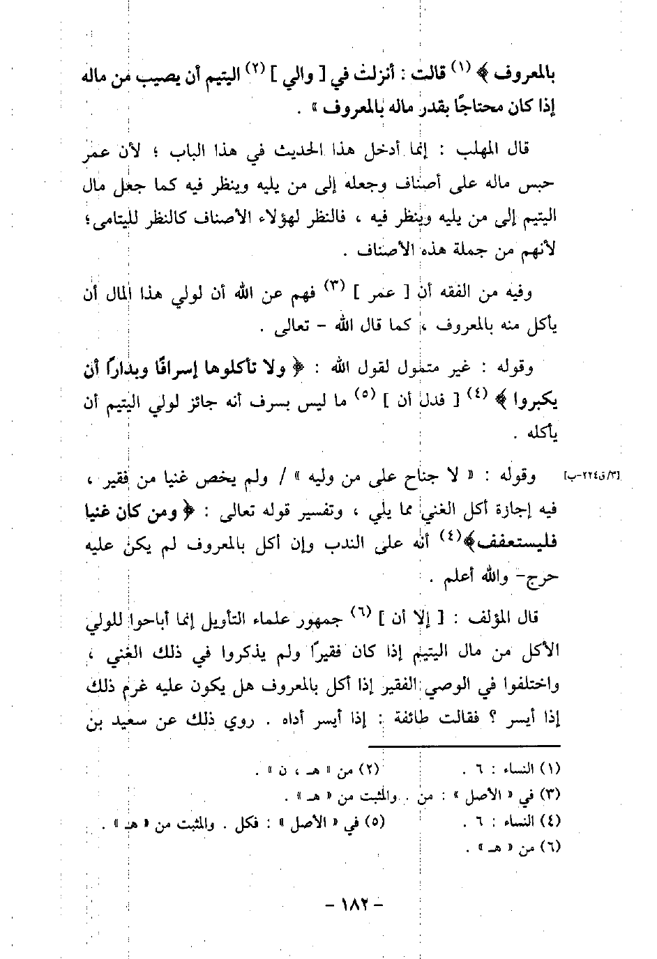 بِالْمَعْرُوفِ) [النساء: 6] قَالَتْ: أُنْزِلَتْ فِى وَالِى الْيَتِيمِ، أَنْ يُصِيبَ مِنْ مَالِهِ إِذَا كَانَ مُحْتَاجًا بِقَدْرِ مَالِهِ بِالْمَعْرُوفِ. قال المهلب: إنما أدخل هذا الحديث فى هذا الباب؛ لأن عمر حبس ماله على أصناف وجعله إلى من يليه وينظر فيه كما جعل مال اليتيم إلى من يليه وينظر فيه، فالنظر لهؤلاء الأصناف كالنظر لليتامى؛ لأنهم من جملة هذه الأصناف. وفيه من الفقه: أن عمر فهم عن الله أن لولى هذا المال أن يأكل منه بالمعروف، كما قال الله تعالى. وقوله: غير متمول لقول الله: (ولا تأكلوها إسرافًا وبدارًا أن يكبوا) [النساء: 6] ، فدل أن ما ليس بسرف أنه جائز لولى اليتيم أن يأكله. وقوله: (لا جناح على من وليه) ولم يخص غنيًا من الفقير، فيه إجازة أكل الغنى ممايلى، وتفسير قوله تعالى: (ومن كان غنيا فليستعفف) [النساء: 6] أنه على الندب وإن أكل بالمعروف لم يكن عليه حرج والله أعلم. قال المؤلف: إلا أن جمهور علماء التأويل إنما أباحوا للولى الأكل من مال اليتيم إذا كان فقيرًا ولم يذكروا فى ذلك الغنى، واختلفوا فى الوصى الفقير إذا أكل بالمعروف هل يكون عليه غرم ذلك إذا أيسر؟ فقالت طائفة: إذا أيسر أداه. روى ذلك عن سعيد بن