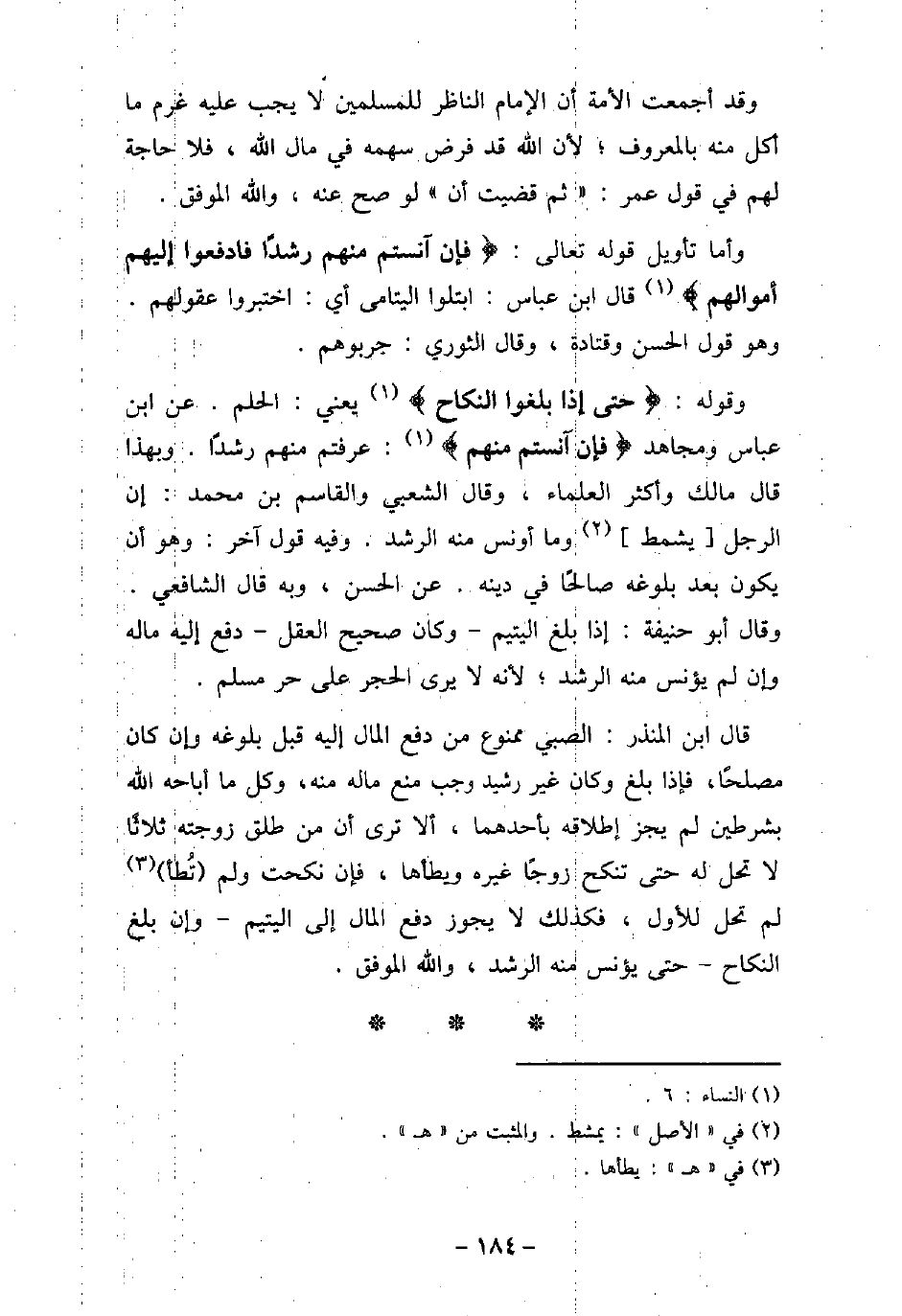 وقد أجمعت الأمة أن الإمام الناظر للمسلمين لا يجب عليه غرم ما أكل منه بالمعروف؛ لأن الله قد فرض سهمه فى مال الله، فلا حاجة لهم فى قول عمر: (ثم قضيت أن) لو صح عنه، والله الموفق. وأما تأويل قوله تعالى: (فإن آنستم منهم رشدًا فادفعوا إليهم أموالهم) [النساء: 6] ، قال ابن عباس: ابتلوا اليتامى أى: اختبروا عقولهم. وهو قول الحسن وقتادة، وقال الثورى: جربوهم. وقوله: (حتى إذا بلغ النكاح) [النساء: 6] ، يعنى الحلم. عن ابن عباس ومجاهد) فإن آنستم منهم) [النساء: 6] عرفتم منهم رشدًا. وبهذا قال مالك وأكثر العلماء، وقال الشعبى، والقاسم بن محمد: إن الرجل يمشط وما أونس منه الرشد. وفيه قول آخر: وهو أن يكون بعد بلوغه صالحًا فى دينه. عن الحسن، وبه قال الشافعى. وقال أبو حنيفة: إذا بلغ اليتيم، وكان صحيح العقل، دفع إليه ماله وإن لم يؤنس منه الرشد؛ لأنه لا يرى الحجر على حر مسلم. قال ابن المنذر: الصبى من دفع المال إليه قبل بلوغه وإن كان مصلحًا، فإذا بلغ وكان غير رشيد وجب منع ماله منه، وكل ما أباحه الله بشرطين لم يجز إطلاقه بأحدهما، ألا ترى أن من طلق زوجته ثلاثًا لا تحل له حتى تنكح غيره ويطأها، فإن نكحت ولم تُطأ لم تحل للأول، فكذلك لا يجوز دفع المال إلى اليتيم، وإن بلغ النكاح، حتى يؤنس منه الرشد، والله الموفق.