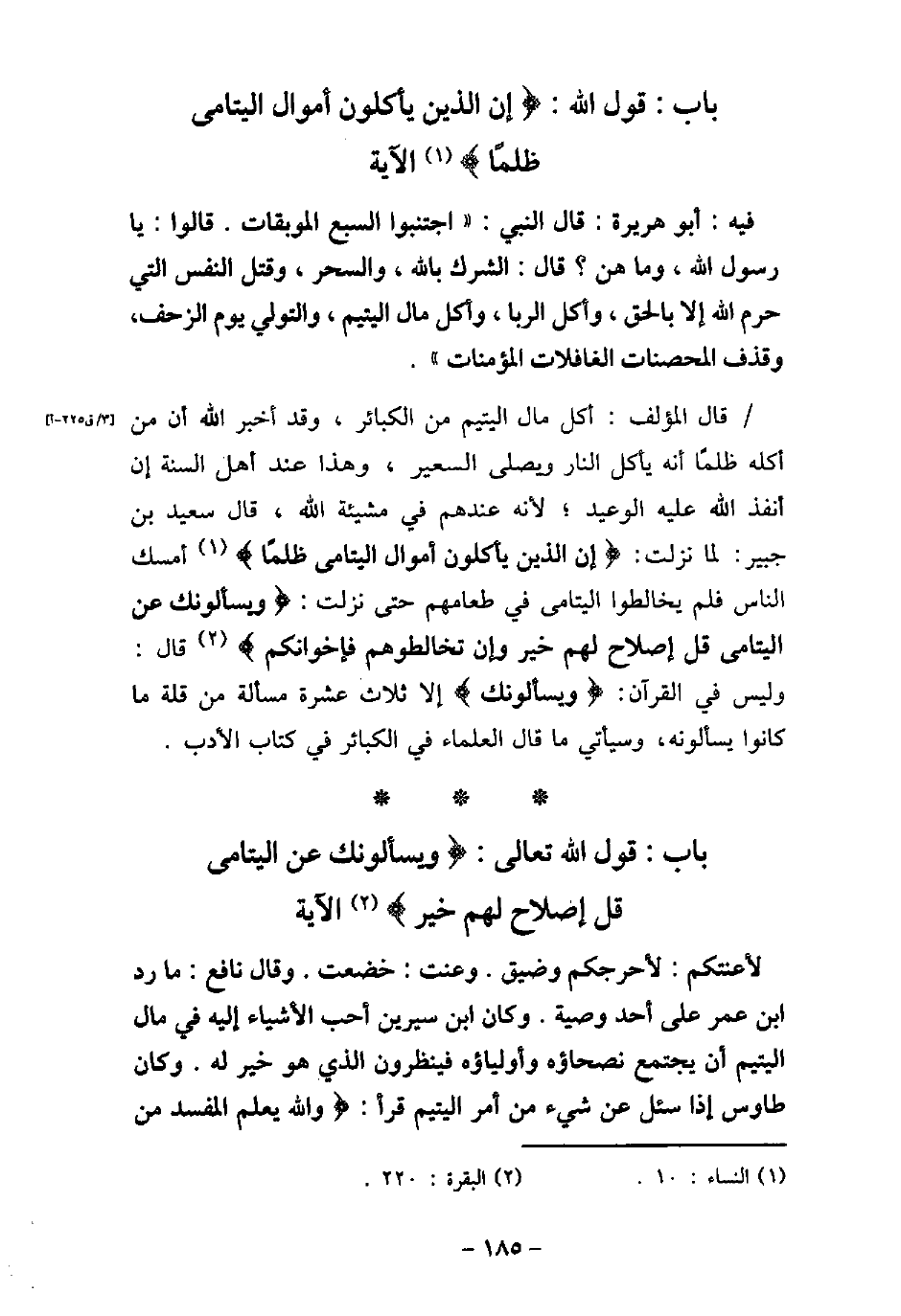 - باب قَوْلِ اللَّهِ: (إِنَّ الَّذِينَ يَأْكُلُونَ أَمْوَالَ الْيَتَامَى ظُلْمًا) [النساء: 10] الآية