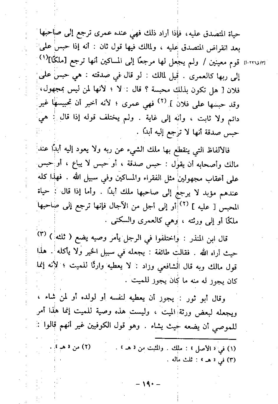 حياة المتصدق عليه، فإذا أراد ذلك فهى عنده عمرى ترجع إلى صاحبها بعد انقراض المتصدق عليه، ولمالك فيها قول ثان: أنه إذا حبس على قوم معينين ولم يجعل لها مرجعًا إلى المساكين أنها ترجع ملكًا إلى ربها كالعمرى. قيل لمالك: لو قال فى صدقته: هى حبس على فلان هل تكون بذلك محبسة؟ قال: لا؛ لأنها لمن ليس بمجهول، وقد حبسها على فلان فهى عمرى؛ لأنه أخبر أن تحبيسها غير دائم ولا ثابت، وأنه إلى غاية. ولم يختلف قوله إذا قال: هى حبس صدقة أنها لا ترجع إليه أبدًا. فالألفاظ التى ينقطع بها ملك الشىء عن ربه ولا يعود إليه أبدًا عند مالك وأصحابه أن يقول: حبس صدقة، أو حبس لا يباع، أو حبس على أعقاب مجهولين مثل الفقراء والمساكين وفى سبيل الله. فهذا كله عندهم مؤبد لا يرجع إلى صاحبها ملك أبدًا. وأما إذا قال: حياة المحبس عليه أو إلى أجل من الآجال فإنها ترجع إلى صاحبها ملكًا أو إلى ورثته، وهى كالعمرى والسكنى. قال ابن المنذر: واختلفوا فى الرجل يأمر وصيه يضع ثلثه حيث أراه الله. فقالت طائفة: يجعله فى سبيل الخير ولا يأكله. هذا قول مالك وبه قال الشافعى وزاد: لا يعطيه وارثًا للميت؛ لأنه إنما كان يجوز له منه ما كان يجوز للميت. وقال أبو ثور: يجوز أن يعطيه لنفسه أو لولده أو لمن شاء، ويجعله لبعض ورثة الميت، وليست هذه وصية للميت إنما هذا أمر للموصى أن يضعه حيث يشاء. وهو قول الكوفيين غير أنهم قالوا: