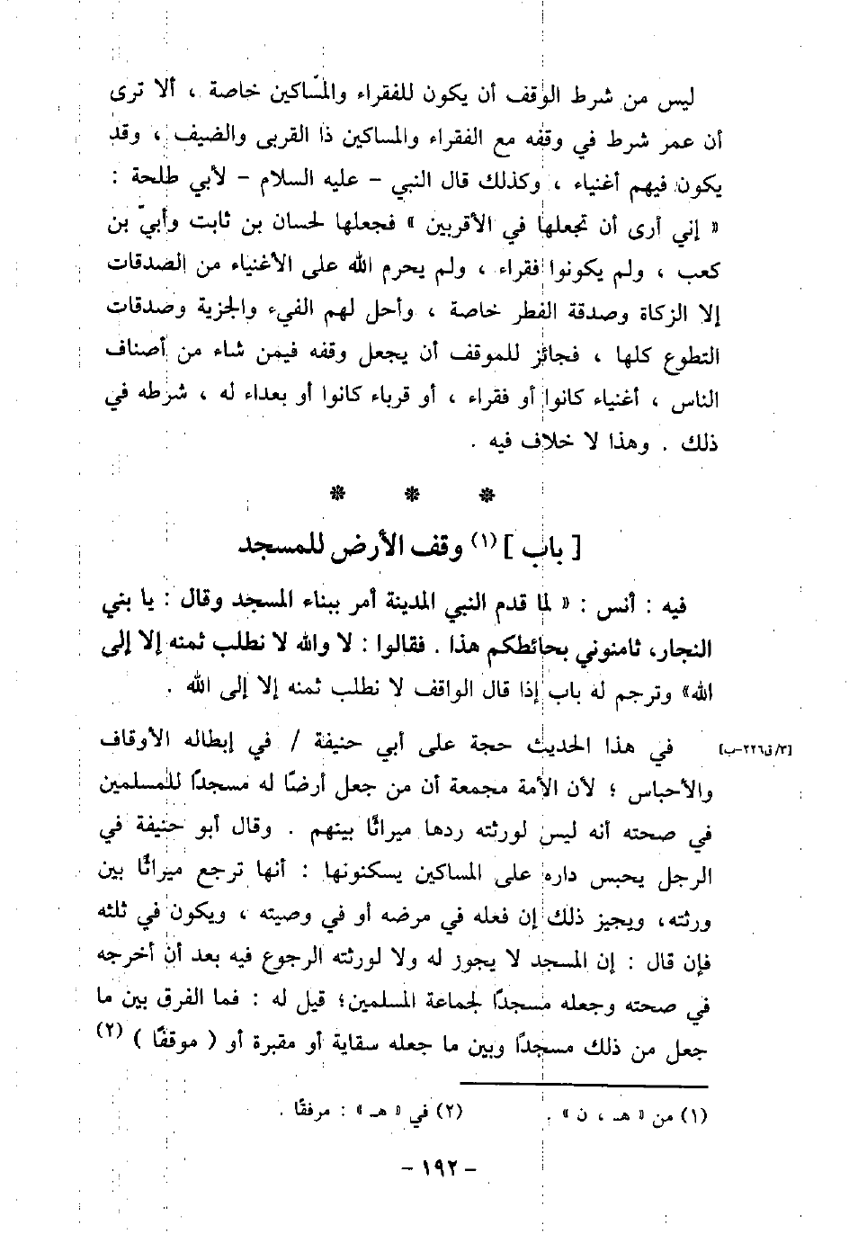 ليس من شرط الوقف أن يكون للفقراء والمسّاكين خاصة، ألا ترى أن عمر شرط فى وقفه مع الفقراء والمساكين ذا القربى والضيف، وقد يكون فيهم أغنياء، وكذلك قال النبى (صلى الله عليه وسلم) لأبى طلحة: (إنى أرى أن تجعلها فى الأقربين) ، فجعلها لحسان بن ثابت، وأبىّ بن كعب، ولم يكونوا فقراء، ولم يحرم الله على الأغنياء من الصدقات إلا الزكاة وصدقة الفطر خاصة، وأحل لهم الفئ والجزية وصدقات التطوع كلها، فجائز للموقف أن يجعل وقفه فيمن شاء من أصناف الناس، أغنياء كانوا أو فقراء، أو قرباء كانوا أو بعداء له، شرطه فى ذلك. وهذا لا خلاف فيه.