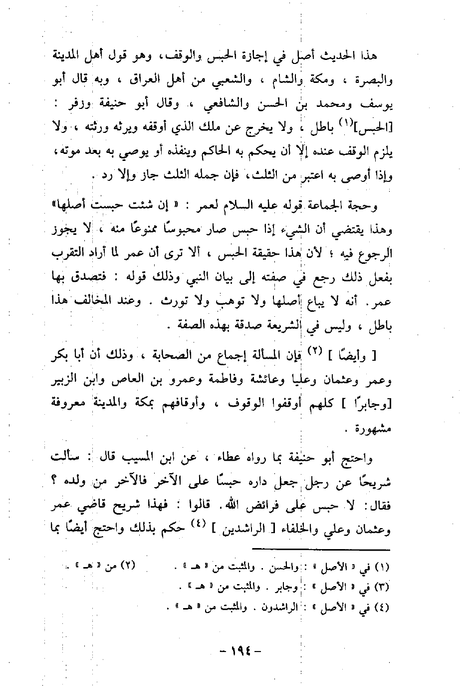 هذا الحديث أصل فى إجازة الحبس والوقف، وهو قول أهل المدينة والبصرة، ومكة والشام، والشعبى من أهل العراق، وبه قال أبو يوسف ومحمد بن الحسن والشافعى، وقال أبو حنيفة وزفر: الحبس باطل، ولا يخرج عن مالك الذى أوقفه ويرثه ورثته، ولا يلزم الوقف عنده إلا أن يحكم به الحاكم وينفذه أو يوصى به بعد موته، وإذا أوصى به اعتبر من الثلث، فإن جمله الثلث جاز وإلا رد. وحجة الجماعة قوله (صلى الله عليه وسلم) لعمر: (إن شئت حبست أصلها) وهذا يقتضى أن الشىء إذا حبس صار محبوسًا ممنوعًا منه، لا يجوز الرجوع فيه؛ لأن هذا حقيقة الحبس، ألا ترى أن عمر لما أراد التقرب بفعل ذلك رجع فى صفته إلى بيان النبى (صلى الله عليه وسلم) وذلك قوله: فتصدق بها عمر. أنه لا يباع أصلها ولا توهب ولا تورث. وعند المخالف هذا باطل، وليس فى الشريعة صدقة بهذه الصفة. وأيضًا فإن المسألة إجماع من الصحابة، وذلك أن أبا بكر، وعمر، وعثمان، وعائشة، وعمرو بن العاص، وابن الزبير، وجابرًا، كلهم أوقفوا الوقوف، وأوقافهم بمكة والمدينة معروفة مشهورة. واحتج أبو حنيفة بما