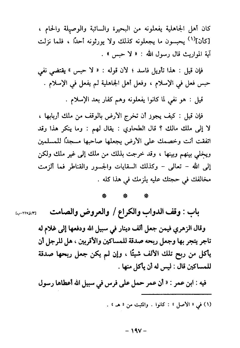 كان أهل الجاهلية يفعلونه من البحيرة والسائبة والوصيلة والحام، كأن يحبسون ما يجعلونه كذلك ولا يورثونه أحدًا، فلما نزلت آية المواريث قال رسول الله (صلى الله عليه وسلم) : (لا حبس) . فإن قيل: هذا تأويل فاسد؛ لأن قوله: (لا حبس) يقتضى نفى حبس فعل فى الإسلام، وفعل أهل الجاهلية لم يفعل فى الإسلام. قيل: هو نفى لما كانوا يفعلونه وهم كفار بعد الإسلام. فإن قيل: كيف يجوز أن تخرج الأرض بالوقف من ملك أربابها، لا إلى ملك مالك؟ قال الصحاوى: يقال لهم: وما ينكر هذا وقد اتفقت أنت وخصمك على الأرض يجعلها صاحبها مسجدًا للمسلمين ويخلى بينهم وبينها، وقد خرجت بذلك من ملك إلى غير ملك ولكن إلى الله تعالى وكذلك الساقيات والجسور والقناطر فما ألزمت مخالفك فى حجتك عليه يلزمك فى هذا كله.