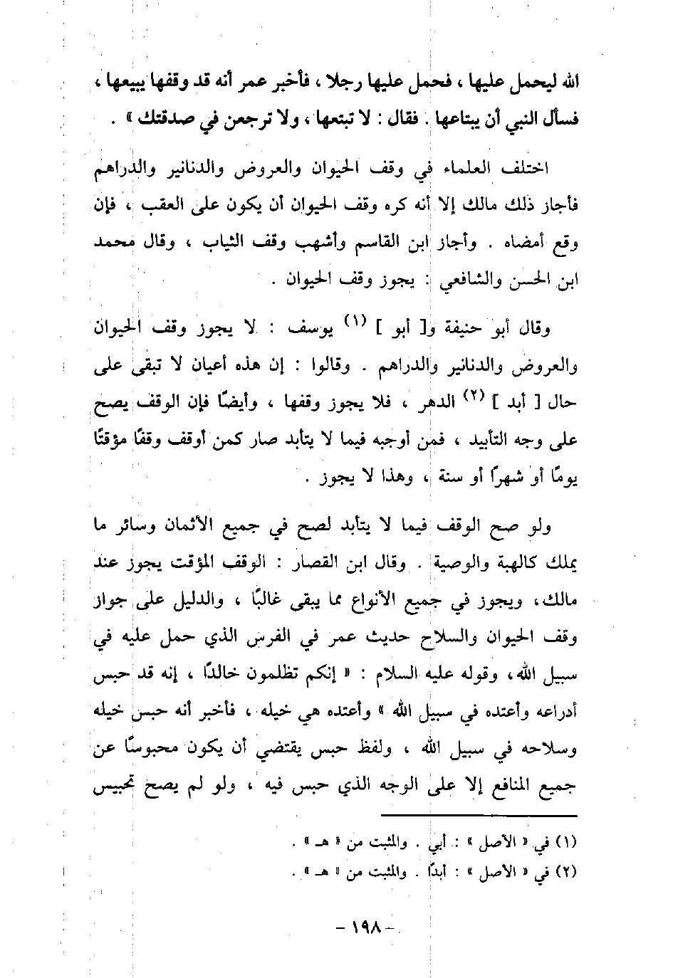 لِيَحْمِلَ عَلَيْهَا فَحَمَلَ عَلَيْهَا رَجُلا، فَأُخْبِرَ عُمَرُ أَنَّهُ قَدْ وَقَفَهَا يَبِيعُهَا، فَسَأَلَ النَّبىَّ (صلى الله عليه وسلم) أَنْ يَبْتَاعَهَا، فَقَالَ: لا تَبْتَعْهَا، وَلا تَرْجِعَنَّ فِى صَدَقَتِكَ) . اختلف العلماء فى وقف الحيوان والعروض والدنانير والدراهم فأجاز ذلك مالك إلا أنه كره وقف الحيوان أن يكون على العقب، فإن وقع أمضاه. وأجاز ابن القاسم وأشهب وقف الثياب، وقال محمد بن الحسن، والشافعى: يجوز وقف الحيوان. وقال أبو حنيفة وأبو يوسف: لا يجوز وقف الحيوان والعروض والدنانير والدراهم. وقالوا: إن هذه أعيان لا تبقى على حال أبد الدهر، فلا يجوز وقفها، وأيضًا فإن الوقف يصح على وجه التأبيد، فمن أوجبه فيما لا يتأبد صار كمن أوقف وقفًا مؤقتًا يومًا أو شهرًا أو سنة، وهذا لا يجوز. ولو صح الوقف فيما لا يتأبد لصح فى جميع الأثمان وسائر ما يملك كالهبة والوصية. وقال ابن القصار: الوقف المؤقت يجوز عند مالك، ويجوز فى جميع الأنواع مما يبقى غالبًا، والدليل على جواز وقف الحيوان والسلاح حديث عمر فى الفرس الذى حمل عليه فى سبيل الله، وقوله (صلى الله عليه وسلم) : (إنكم تظلمون خالدًا، إنه قد حبس أدراعه وأعتده فى سبيل الله) وأعتده هى خيله، فأخبر أنه حبس خيله وسلاحه فى سبيل الله، ولفظ حبس يقتضى أن يكون محبوسًا عن جميع المنافع إلا على الوجه الذى حبس فيه، ولو لم يصح تحبيس