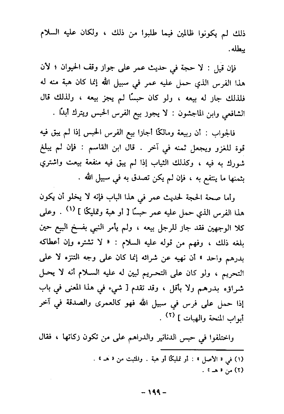 ذلك لم يكونوا ظالمين فيما طلبوا من ذلك، ولكان (صلى الله عليه وسلم) يبطله. فإن قيل: لا حجة فى حديث عمر على جواز وقف الحيوان؛ لأن هذا الفرس الذى حمل عليه عمر فى سبيل الله إنما كان هبة منه له فلذلك جاز له بيعه، ولو كان حبسًا لم يجز بيعه، ولذلك قال الشافعى وابن الماجشون: لا يجوز بيع الفرس الحبس ويترك أبدًا. فالجواب: أن ربيعة ومالكًا أجازا بيع الفرس الحبس إذا لم يبق فيه قوة للغزو ويجعل ثمنه فى آخره. قال ابن لقاسم: فإن لم يبلغ شورك به فيه، وكذلك الثياب إذا لم يبق فيه منفعة بيعت واشترى بثمنها ما ينتفع به، فإن لم يكن تصدق به فى سبيل الله. وأما صحة الحجة لحديث عمر فى هذا الباب فإنه لا يخلو أن يكون هذا الفرس الذى حمل عليه عمر حبسًا أو هبة وتمليكًا. وعلى كلا الوجهين فقد جاز للرجل بيعه، ولم يأمر النبى (صلى الله عليه وسلم) بفسخ البيع حين بلغه ذلك، وفهم من قوله (صلى الله عليه وسلم) : (لا تشتره وإن أعطاكه بدرهم واحد) أن نهيه عن شرائه إنما كان على وجه التنزه لا على التحريم، ولو كان على التحريم لبين له (صلى الله عليه وسلم) أنه لا يحل شراؤه بدرهم ولا بأقل، وقد تقدم شىء فى هذا المعنى فى باب إذا حمل على فرس فى سبيل الله فهو كالعمرى والصدقة فى آخر أبواب المنحة والهبات. واختلفوا فى حبس الدنانير والدراهم على من تكون زكاتها، فقال