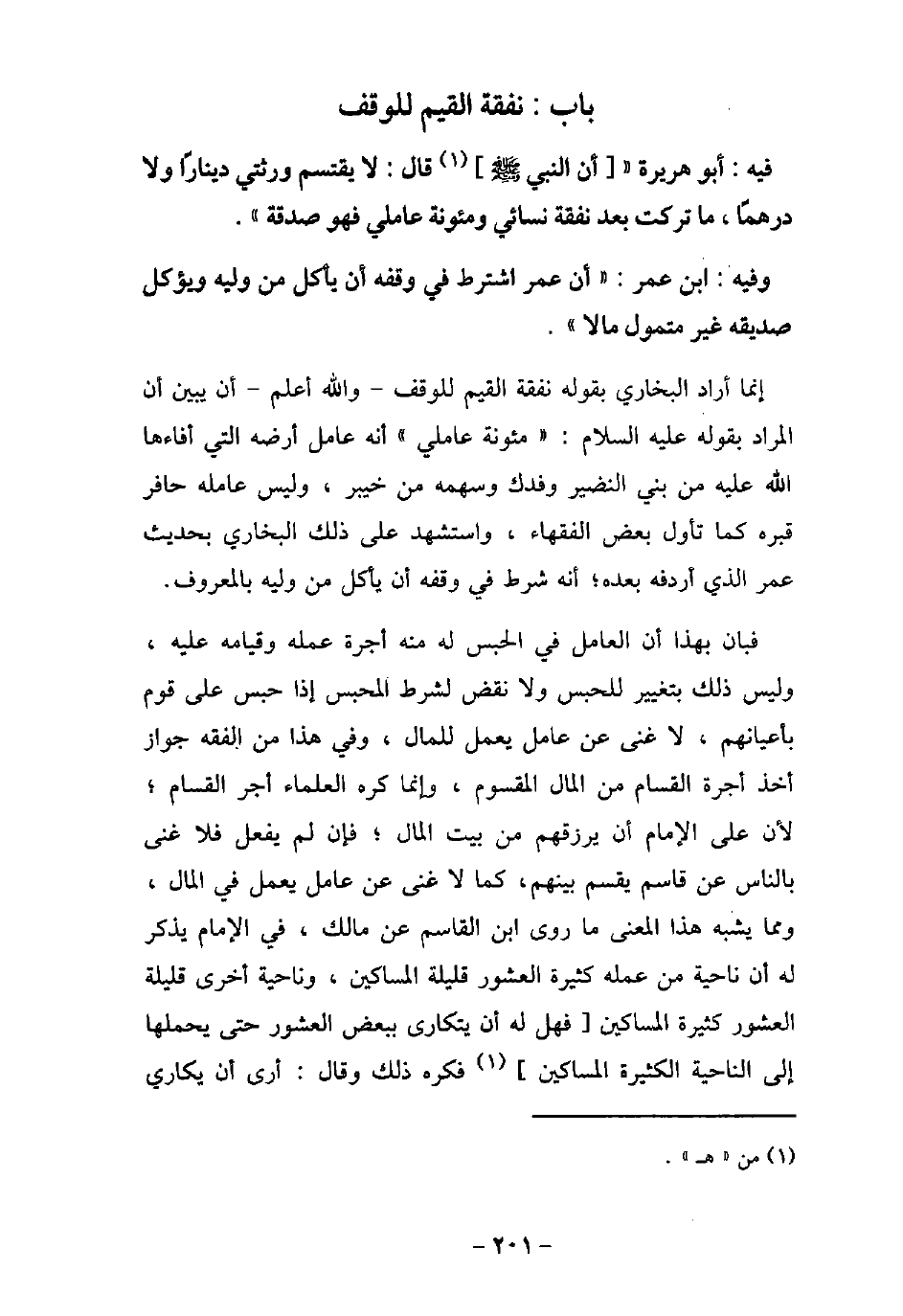 / 35 - فيه: أَبُو هُرَيْرَةَ أَنَّ النَّبىَّ (صلى الله عليه وسلم) قَالَ: لا يَقْتَسِمُ وَرَثَتِى دِينَارًا وَلا دِرْهَمًا، مَا تَرَكْتُ بَعْدَ نَفَقَةِ نِسَائِى وَمَؤُنَةِ عَامِلِى، فَهُوَ صَدَقَةٌ) . / 36 - وفيه: ابْنِ عُمَرَ أَنَّ عُمَرَ اشْتَرَطَ فِى وَقْفِهِ أَنْ يَأْكُلَ مَنْ وَلِيَهُ، وَيُؤْكِلَ صَدِيقَهُ غَيْرَ مُتَمَوِّلٍ مَالا. إنما أراد البخارى بقوله نفقة القيم للوقف والله أعلم أن يبين أن المراد بقوله (صلى الله عليه وسلم) : (مئونة عاملى) أنه عامل أرضه التى أفاءها الله عليه من بنى النضير وفدك وسهمه من خيبر، وليس عامله حافر قبره كما تأول بعض الفقهاء، واستشهد على ذلك البخارى بحديث عمر الذى أردفه بعده؛ أنه شرط فى وقفه أن يأكل من وليه بالمعروف. فبان بهذا أن العامل فى الحبس له منه أجرة عمله وقيامه عليه، وليس ذلك بتغيير للحبس ولا نقض لشرط المحبس إذا حبس على قوم بأعيانهم، لا غنى عن عامل يعمل للمال، وفى هذا من الفقه جواز أخذ أجرة القسام من المال المقسوم، وإنما كره العلماء أجر القسام؛ لأن على الإمام أن يرزقهم من بيت المال؛ فإن لم يفعل فلا غنى بالناس عن قاسم يقسم بينهم، كما لا غنى عن عامل يعمل فى المال، ومما يشبه هذا المعنى ما روى ابن القاسم عن مالك، فى الإمام يذكر له أن ناحية من عمله كثيرة العشور قليلة المساكين، وناحية أخرى قليلة العشور كثيرة المساكين فهل له أن يتكارى ببعض العشور حتى يحملها إلى الناحية الكثيرة المساكين فكره ذلك وقال: أرى أن يكارى