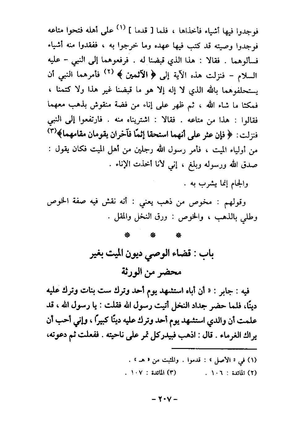 فوجدوا فيها أشياء فأخذاها، فلما قدما على أهله فتحوا متاعه فوجدوا وصيته قد كتب فيها عهده وما خرجوا به، ففقدوا منه أشياء فسألوهما، فقالا: هذا الذى قبضنا له. فرفعوهما إلى النبى (صلى الله عليه وسلم) فنزلت هذه الآية إلى: (الآثمين) [المائدة: 106] فأمرهما النبى (صلى الله عليه وسلم) أن يستحلفوهما بالله الذى لا إله إلا هو ما قبضنا غير هذا ولا كتمنا، فمكثا ما شاء الله، ثم ظهر على إناء من فضة منقوش بذهب معهما فقالوا: هذا من متاعه. فقالا: اشتريناه منه. فارتفعوا إلى النبى (صلى الله عليه وسلم) فنزلت: (فإن عثر على أنهما استحقا إثمًا فآخران يقومان مقامهما) [المائدة: 107] من أولياء الميت، فأمر رسول الله (صلى الله عليه وسلم) رجلين من أهل الميت فكان يقول: صدق الله ورسوله وبلغ، إنى لأنا أخذت الإناء. والجام إنما يشرب به. وقولهم: مخوص من ذهب يعنى: أنه نقش فيه صفة الخوص وطلى بالذهب، والخوص: ورق النخل والمقل.