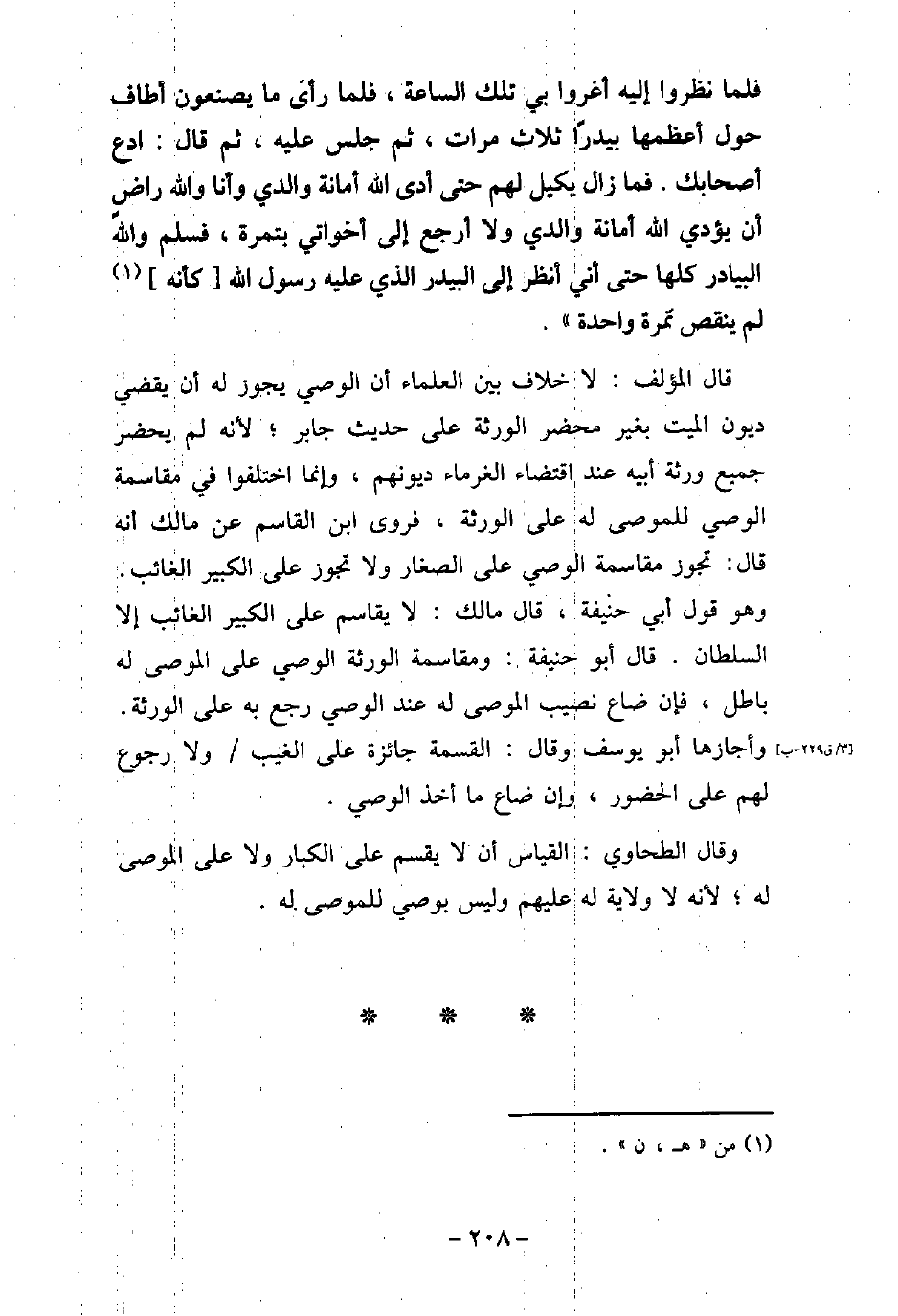 فَلَمَّا نَظَرُوا إِلَيْهِ أُغْرُوا بِى تِلْكَ السَّاعَةَ، فَلَمَّا رَأَى مَا يَصْنَعُونَ أَطَافَ حَوْلَ أَعْظَمِهَا بَيْدَرًا ثَلاثَ مَرَّاتٍ، ثُمَّ جَلَسَ عَلَيْهِ، ثُمَّ قَالَ: ادْعُ أَصْحَابَكَ، فَمَا زَالَ يَكِيلُ لَهُمْ حَتَّى أَدَّى اللَّهُ أَمَانَةَ وَالِدِى، وَأَنَا وَاللَّهِ رَاضٍ أَنْ يُؤَدِّىَ، اللَّهُ أَمَانَةَ وَالِدِى وَلا أَرْجِعَ إِلَى أَخَوَاتِى بِتَمْرَةٍ، فَسَلِمَ وَاللَّهِ الْبَيَادِرُ كُلُّهَا، حَتَّى أَنِّى أَنْظُرُ إِلَى الْبَيْدَرِ الَّذِى عَلَيْهِ رَسُولُ اللَّهِ (صلى الله عليه وسلم) كَأَنَّه لَمْ يَنْقُصْ تَمْرَةً وَاحِدَةً) . قال المؤلف: لا خلاف بين العلماء أن الوصى يجوز له أن يقضى ديون الميت بغير محضر الورثة على حديث جابر؛ لأنه لم يحضر جميع ورثة أبيه عند اقتضاء الغرماء ديونهم، وإنما اختلفوا فى مقاسمة الوصى للموصى له على الورثة، فروى ابن القاسم عن مالك أنه قال: تجوز مقامسة الوصى على الصغار ولا تجوز على الكبير الغائب. وهو قول أبى حنيفة، قال مالك: لا يقاسم على الكبير الغائب إلا السلطان. قال أبو حنيفة: ومقاسمة الورثة الوصى على الموصى له باطل، فإن ضاع نصيب الموصى له عند الوصى رجع به على الورثة. وأجازها أبو يوسف وقال: القسمة جائزة على الغيب ولا رجوع لهم على الحضور، وإن ضاع ما أخذ الوصى. وقال الطحاوى: القياس أن لا يقسم على الكبار ولا على الموصى له؛ لأنه لا ولاية له عليهم وليس يوصى للموصى له.