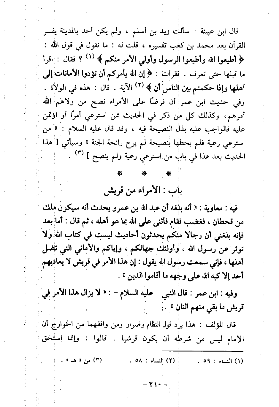 / 3 - فيه: مُعَاوِيَةَ أَنَّه بلغه أَنَّ عَبْدَاللَّهِ بْنَ عَمْرٍو يُحَدِّثُ أَنَّهُ سَيَكُونُ مَلِكٌ مِنْ قَحْطَانَ، فَغَضِبَ، فَقَامَ فَأَثْنَى عَلَى اللَّهِ بِمَا هُوَ أَهْلُهُ، ثُمَّ قَالَ: أَمَّا بَعْدُ، فَإِنَّهُ بَلَغَنِى أَنَّ رِجَالا مِنْكُمْ يُحَدِّثُونَ أَحَادِيثَ لَيْسَتْ فِى كِتَابِ اللَّهِ، وَلا تُوثَرُ عَنْ رَسُولِ اللَّهِ (صلى الله عليه وسلم) ، وَأُولَئِكَ جُهَّالُكُمْ، فَإِيَّاكُمْ وَالأمَانِىَّ الَّتِى تُضِلُّ أَهْلَهَا، فَإِنِّى سَمِعْتُ رَسُولَ اللَّهِ (صلى الله عليه وسلم) ، يَقُولُ: (إِنَّ هَذَا الأمْرَ فِى قُرَيْشٍ لا يُعَادِيهِمْ أَحَدٌ إِلا كَبَّهُ اللَّهُ فِى النَّارِ عَلَى وَجْهِهِ، مَا أَقَامُوا الدِّينَ) . / 4 - وفيه: ابْنُ عُمَرَ: قَالَ النَّبىُّ (صلى الله عليه وسلم) : (لا يَزَالُ هَذَا الأمْرُ فِى قُرَيْشٍ مَا بَقِىَ مِنْهُمُ اثْنَانِ) . قال المؤلف: هذا يرد قول النظام وضرار ومن وافقهما من الخوارج أن الإمام ليس من شرطه أن يكون قرشيا. قالوا: وإنما استحق
