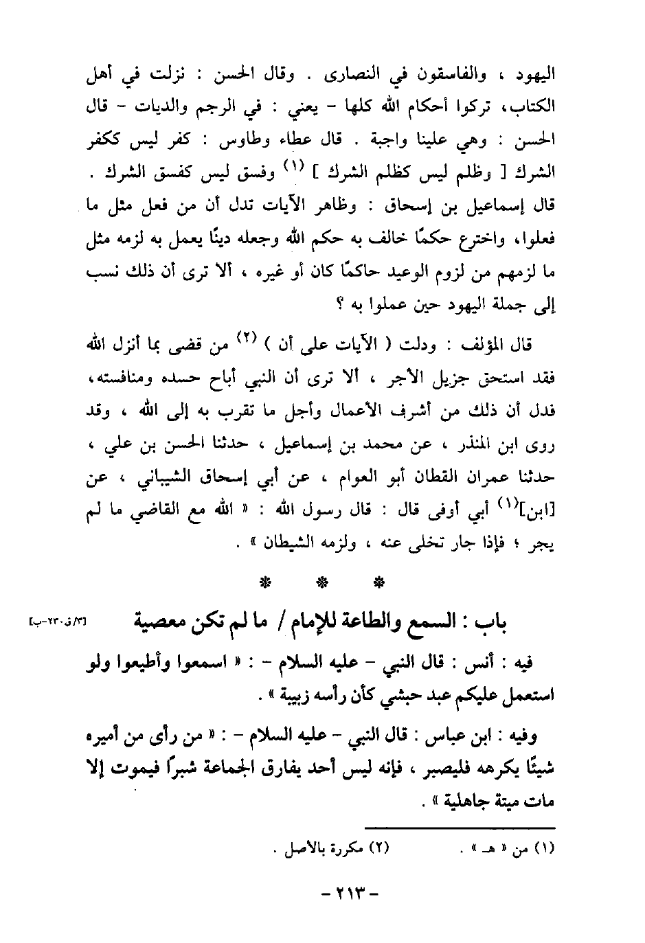 / 6 - فيه: أَنَسِ: قَالَ رَسُولُ اللَّهِ (صلى الله عليه وسلم) : (اسْمَعُوا وَأَطِيعُوا، وَإِنِ اسْتُعْمِلَ عَلَيْكُمْ عَبْدٌ حَبَشِيٌّ كَأَنَّ رَأْسَهُ زَبِيبَةٌ) . / 7 - وفيه: ابْنِ عَبَّاسٍ قَالَ النَّبِىُّ (صلى الله عليه وسلم) : (مَنْ رَأَى مِنْ أَمِيرِهِ شَيْئًا فَكَرِهَهُ، فَلْيَصْبِرْ فَإِنَّهُ لَيْسَ أَحَدٌ يُفَارِقُ الْجَمَاعَةَ شِبْرًا، فَيَمُوتُ إِلا مَاتَ مِيتَةً جَاهِلِيَّةً) .
