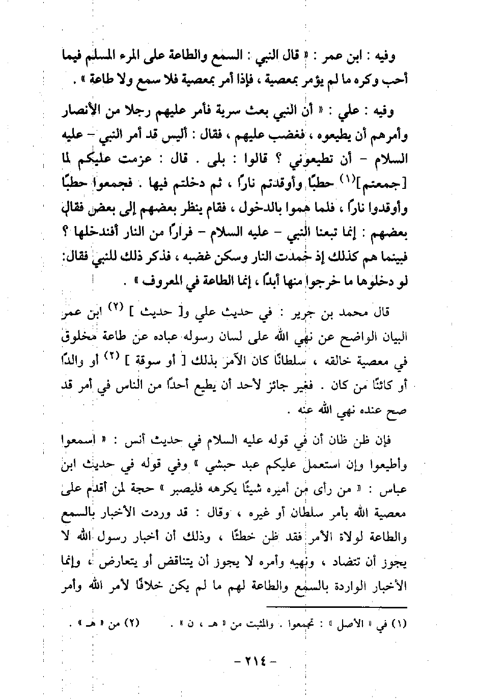 / 8 - وفيه: ابْنُ عُمَرَ، قَالَ النَّبِىِّ (صلى الله عليه وسلم) : (السَّمْعُ وَالطَّاعَةُ عَلَى الْمَرْءِ الْمُسْلِمِ فِيمَا أَحَبَّ وَكَرِهَ، مَا لَمْ يُؤْمَرْ بِمَعْصِيَةٍ، فَإِذَا أُمِرَ بِمَعْصِيَةٍ فَلا سَمْعَ وَلا طَاعَةَ) . / 9 - وفيه: عَلِىٍّ: أَنَّ النَّبِىُّ (صلى الله عليه وسلم) بَعَثَ سَرِيَّةً، وَأَمَّرَ عَلَيْهِمْ رَجُلا مِنَ الأنْصَارِ، وَأَمَرَهُمْ أَنْ يُطِيعُوهُ، فَغَضِبَ عَلَيْهِمْ، وَقَالَ: أَلَيْسَ قَدْ أَمَرَ النَّبِىُّ (صلى الله عليه وسلم) أَنْ تُطِيعُونِى؟ قَالُوا: بَلَى قَالَ: قَدْ عَزَمْتُ عَلَيْكُمْ لَمَا جَمَعْتُمْ حَطَبًا، وَأَوْقَدْتُمْ نَارًا، ثُمَّ دَخَلْتُمْ فِيهَا، فَجَمَعُوا حَطَبًا، فَأَوْقَدُوا نَارًا، فَلَمَّا هَمُّوا بِالدُّخُولِ، فَقَامَ يَنْظُرُ بَعْضُهُمْ إِلَى بَعْضٍ، فَقَالَ بَعْضُهُمْ: إِنَّمَا تَبِعْنَا النَّبِىَّ (صلى الله عليه وسلم) فِرَارًا مِنَ النَّارِ، أَفَنَدْخُلُهَا؟ فَبَيْنَمَا هُمْ كَذَلِكَ؛ إِذْ خَمَدَتِ النَّارُ وَسَكَنَ غَضَبُهُ، فَذُكِرَ لِلنَّبِىِّ (صلى الله عليه وسلم) فَقَالَ: (لَوْ دَخَلُوهَا مَا خَرَجُوا مِنْهَا أَبَدًا إِنَّمَا الطَّاعَةُ فِى الْمَعْرُوفِ) . قال محمد بن جرير: فى حديث على وحديث ابن عمر البيان الواضح عن نهى الله على لسان رسوله عباده عن طاعة مخلوق فى معصية خالقه، سلطانًا كان الآمر بذلك، أو سوقة، أو والدًا، أو كائنًا من كان. فغير جائز لأحد أن يطيع أحدًا من الناس فى أمر قد صح عنده نهى الله عنه. فإن ظن ظان أن فى قوله (صلى الله عليه وسلم) فى حديث أنس: (اسمعوا وأطيعوا وإن استعمل عليكم عبد حبشى) وفى قوله فى حديث ابن عباس: (من رأى من أميره شيئًا يكرهه فليصبر) حجة لمن أقدم على معصية الله بأمر سلطان أو غيره، وقال: قد وردت الأخبار بالسمع والطاعة لولاة الأمر فقد ظن خطئًا، وذلك أن أخبار رسول الله (صلى الله عليه وسلم) لا يجوز أن تتضاد، ونهيه وأمره لا يجوز أن يتناقض أو يتعارض، وإنما الأخبار الواردة بالسمع والطاعة لهم ما لم يكن خلافًا لأمر الله وأمر