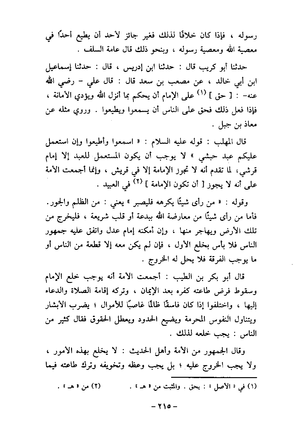 رسوله، فإذا كان خلافًا لذلك فغير جائز لأحد أن يطيع أحدًا فى معصية الله ومعصية رسوله، وبنحو ذلك قال عامة السلف. حدثنا أبو كريب قال: حدثنا ابن إدريس، قال: حدثنا إسماعيل بن أبى خالد، عن مصعب بن سعد قال: قال على، رضى الله عنه: حق على الإمام أن يحكم بما أنزل الله ويؤدى الأمانة، فإذا فعل ذلك فحق على الناس أن يسمعوا ويطيعوا. وروى مثله عن معاذ بن جبل. قال المهلب: قوله (صلى الله عليه وسلم) : (اسمعوا وأطيعوا وإن استعمل عليكم عبد حبشى) لا يوجب أن يكون المستعمل للعبد إلا إمام قرشى، لما تقدم أنه لا تجوز الإمامة إلا فى قريش، وإنما أجمعت الأمة على أنه لا يجوز أن تكون الإمامة فى العبيد. وقوله: (من رأى شيئًا يكرهه فليصبر) يعنى: من الظلم والجور. فأما من رأى شيئًا من معارضة الله ببدعة أو قلب شريعة، فليخرج من تلك الأرض ويهاجر منها، وإن أمكنه إمام عدل واتفق عليه جمهور الناس فلا بأس بخلع الأول، فإن لم يكن معه إلا قطعة من الناس أو ما يوجب الفرقة فلا يحل له الخروج. قال أبو بكر بن الطيب: أجمعت الأمة أنه يوجب خلع الإمام وسقوط فرض طاعته كفره بعد الإيمان، وتركه إقامة الصلاة والدعاء إليها، واختلفوا إذا كان فاسقًا ظالمًا غاصبًا للأموال؛ يضرب الأبشار ويتناول النفوس المحرمة ويضيع الحدود ويعطل الحقوق فقال كثير من الناس: يجب خلعه لذلك. وقال الجمهور من الأمة وأهل الحديث: لا يخلع بهذه الأمور، ولا يجب الخروج عليه؛ بل يجب وعظه وتخويفه وترك طاعته فيما
