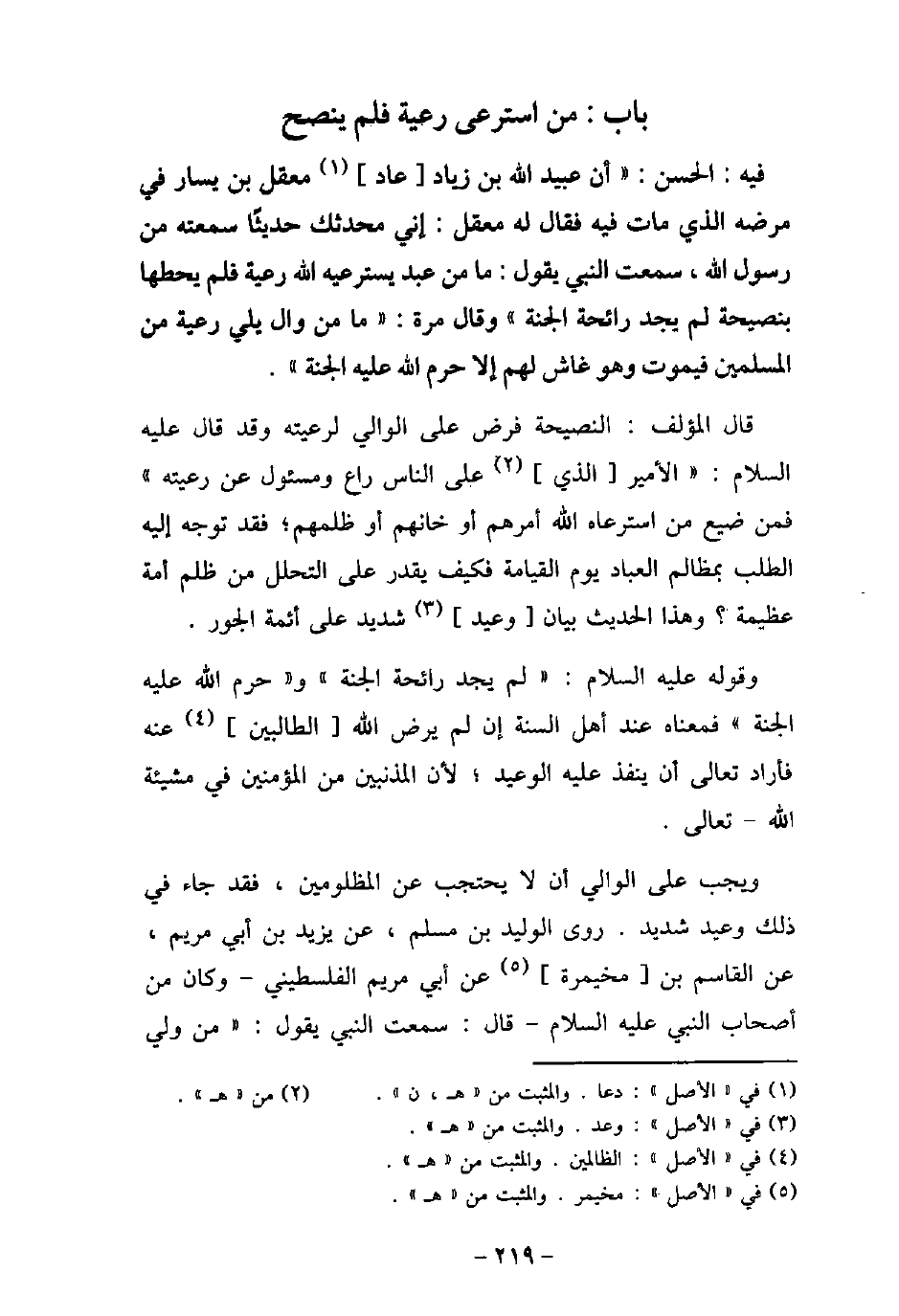 / 13 - فيه: الْحَسَنِ، أَنَّ عُبَيْدَاللَّهِ بْنَ زِيَادٍ عَادَ مَعْقِلَ بْنَ يَسَارٍ فِى مَرَضِهِ الَّذِى مَاتَ فِيهِ، فَقَالَ لَهُ مَعْقِلٌ: إِنِّى مُحَدِّثُكَ حَدِيثًا سَمِعْتُهُ مِنْ رَسُولِ اللَّهِ (صلى الله عليه وسلم) ، سَمِعْتُ النَّبِىَّ (صلى الله عليه وسلم) يَقُولُ: (مَا مِنْ عَبْدٍ اسْتَرْعَاهُ اللَّهُ رَعِيَّةً، فَلَمْ يَحُطْهَا بِنَصِيحَةٍ، إِلا لَمْ يَجِدْ رَائِحَةَ الْجَنَّةِ) . وقال مرة: (ما من وال يلى رعية من المسلمين، فيموت وهو غاش لهم إلا حرم الله عليه الجنة) . قال المؤلف: النصيحة فرض على الوالى لرعيته وقد قال (صلى الله عليه وسلم) : (الأمير الذى على الناس راع ومسئول عن رعيته) فمن ضيع من استرعاه الله أمرهم أو خانهم أو ظلمهم؛ فقد توجه إليه الطلب بمظالم العباد يوم القيامة فكيف يقدر على التحلل من ظلم أمة عظيمة؟ وهذا الحديث بيان وعيد شديد على أئمة الجور. وقوله (صلى الله عليه وسلم) : (لم يجد رائحة الجنة) و (حرم الله عليه الجنة) فمعناه عند أهل السنة إن لم يرض الله الطالبين عنه فأراد تعالى أن ينفذ عليه الوعيد؛ لأن المذنبين من المؤمنين فى مشيئة الله تعالى. ويجب على الوالى أن لا يحتجب عن المظلومين، فقد جاء فى ذلك وعيد شديد. روى الوليد بن مسلم، عن يزيد بن أبى مريم، عن القاسم بن مخيمرة، عن أبى مريم الفلسطينى، وكان من أصحاب النبى (صلى الله عليه وسلم) ، قال: سمعت النبى (صلى الله عليه وسلم) يقول: (من ولى