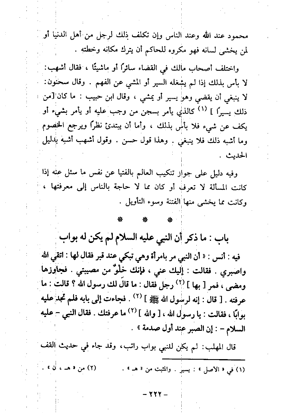 محمود عند الله وعند الناس وإن تكلف ذلك لرجل من أهل الدنيا أو لمن يخشى لسانه فهو مكروه للحاكم أن يترك مكانه وخطته. واختلف أصحاب مالك فى القضاء سائرًا أو ماشيئًا، فقال أشهب: لا بأس بذلك إذا لم يشغله السير أو المشى عن الفهم. وقال سحنون: لا ينبغى أن يقضى وهو يسير أو يمشى، وقال ابن حبيب: ما كان من ذلك يسيرًا كالذى يأمر بسجن من وجب عليه أو يأمر بشىء أو يكف عن شىء فلا بأس بذلك، وأما أن يبتدئ نظرًا ويرجع الخصوم وما أشبه ذلك فلا ينبغى. وهذا قول حسن. وقول أشهب أشبه بدليل الحديث. وفيه دليل على جواز تنكيب العالم بالفتيا عن نفس ما سئل عنه إذا كانت المسألة لا تعرف أو كان مما لا حاجة بالناس إلى معرفتها، وكانت مما يخشى منها الفتنة وسوء التأويل.