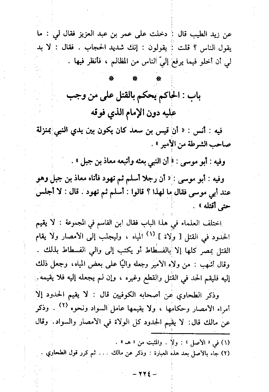 / 17 - فيه: أَنَسِ: إِنَّ قَيْسَ بْنَ سَعْدٍ كَانَ يَكُونُ بَيْنَ يَدَىِ النَّبِىِّ (صلى الله عليه وسلم) بِمَنْزِلَةِ صَاحِبِ الشُّرَطِ مِنَ الأمِيرِ) . / 18 - وفيه: أَبُو مُوسَى أَنَّ النَّبِىَّ (صلى الله عليه وسلم) بَعَثَهُ، وَأَتْبَعَهُ بِمُعَاذٍ بن جبل. / 19 - وفيه: أَبُو مُوسَى: أَنَّ رَجُلا أَسْلَمَ ثُمَّ تَهَوَّدَ، فَأَتَى مُعَاذُ بْنُ جَبَلٍ، وَهُوَ عِنْدَ أَبِى مُوسَى، فَقَالَ: مَا لِهَذَا؟ قَالَ: أَسْلَمَ ثُمَّ تَهَوَّدَ، قَالَ: لا أَجْلِسُ حَتَّى أَقْتُلَهُ. اختلف العلماء فى هذا الباب فقال ابن القاسم فى المجموعة: لا يقيم الحدود فى القتل ولاة المياه، وليجلب إلى الأمصار ولا يقام القتل بمصر كلها إلا بالفسطاط أو يكتب إلى والى الفسطاط بذلك. وقال أشهب: من ولاه الأمير وجعله واليًا على بعض المياه، وجعل ذلك إليه فليقم الحد فى القتل والقطع وغيره، وإن لم يجعله إليه فلا يقيمه. وذكر الطحاوى عن أصحابه الكوفيين قال: لا يقيم الحدود إلا أمراء الأمصار وحكامها، ولا يقيمها عامل السواد ونحوه. وذكر عن مالك قال: لا يقيم الحدود كل الولاة فى الأمصار والسواد. وقال