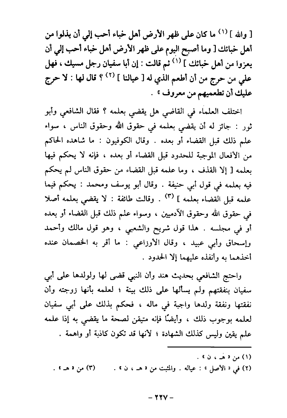 وَاللَّهِ مَا كَانَ عَلَى ظَهْرِ الأرْضِ أَهْلُ خِبَاءٍ أَحَبَّ إِلَىَّ أَنْ يَذِلُّوا مِنْ أَهْلِ خِبَائِكَ، وَمَا أَصْبَحَ الْيَوْمَ عَلَى ظَهْرِ الأرْضِ أَهْلُ خِبَاءٍ أَحَبَّ إِلَىَّ أَنْ يَعِزُّوا مِنْ أَهْلِ خِبَائِكَ، ثُمَّ قَالَتْ: إِنَّ أَبَا سُفْيَانَ رَجُلٌ مِسِّيكٌ، فَهَلْ عَلَىَّ مِنْ حَرَجٍ أَنْ أُطْعِمَ مِنِ الَّذِى لَهُ عِيَالَنَا؟ قَالَ لَهَا: لا حَرَجَ عَلَيْكِ أَنْ تُطْعِمِيهِمْ مِنْ مَعْرُوفٍ) . اختلف العلماء فى القاضى هل يقضى بعلمه؟ فقال الشافعى وأبو ثور: جائز له أن يقضى بعلمه فى حقوق الله وحقوق الناس، سواء علم ذلك قبل القضاء أو بعده. وقال الكوفيون: ما شاهده الحاكم من الأفعال الموجبة للحدود قبل القضاء أو بعده، فإنه لا يحكم فيها بعلمه إلا القذف، وما علمه قبل القضاء من حقوق الناس لم يحكم فيه بعلمه فى قول أبى حنيفة. وقال أبو يوسف ومحمد: يحكم فيما علمه قبل القضاء بعلمه. وقالت طائفة: لا يقضى بعلمه أصلا فى حقوق الله وحقوق الآدميين، وسواء علم ذلك قبل القضاء أو بعده أو فى مجلسه. هذا قول شريح والشعبى، وهو قول مالك وأحمد وإسحاق وأبى عبيد، وقال الأوزاعى: ما أقر به الخصمان عنده أخذهما به وأنفذه عليهما إلا الحدود. واحتج الشافعى بحديث هند وأن النبى (صلى الله عليه وسلم) قضى لها ولولدها على أبى سفيان بنفقتهم ولم يسألها على ذلك بينة؛ لعلمه بأنها زوجته وأن نفقتها ونفقة ولدها واجبة فى ماله، فحكم بذلك على أبى سفيان لعلمه بوجوب ذلك، وأيضًا فإنه متيقن لصحة ما يقضى به إذا علمه علم يقين وليس كذلك الشهادة؛ لأنها قد تكون كاذبة أو واهمة.