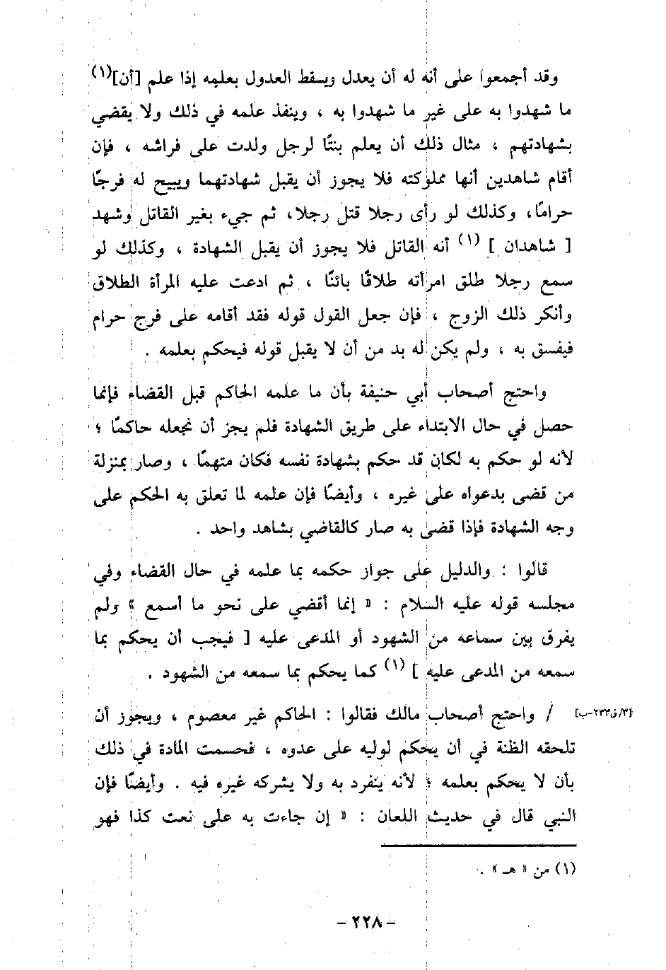 وقد أجمعوا على أنه له أن يعدل ويسقط العدول بعلمه إذا علم أن ماشهدوا به على غير ما شهدوا به، وينفذ علمه فى ذلك ولا يقضى بشهادتهم، مثال ذلك أن يعلم بنتًا لرجل ولدت على فراشه، فإن أقام شاهدين أنها مملوكته فلا يجوز أن يقبل شهادتهما ويبيح له فرجًا حرامًا، وكذلك لو رأى رجلا قتل رجلا، ثم جئ بغير القاتل وشهد شاهدان أنه القاتل فلا يجوز أن يقبل الشهادة، وكذلك لو سمع رجلا طلق امرأته طلاقًا بائنًا، ثم ادعت عليه المرأة الطلاق وأنكر ذلك الزوج، فإن جعل القول قوله فقد أقامه على فرج حرام فيفسق به، ولم يكن له بد من أن لا يقبل قوله فيحكم بعلمه. واحتج أصحاب أبى حنيفة بأن ما علمه الحاكم قبل القضاء فإنما حصل فى حال الابتداء على طريق الشهادة فلم يجز أن نجعله حاكمًا؛ لأنه لو حكم له لكان قد حكم بشهادة نفسه فكان متهمًا، وصار بمنزلة من قضى بدعواه على غيره، وأيضًا فإن علمه لما تعلق به الحكم على وجه الشهادة فإذا قضى به صار كالقاضى بشاهد واحد. قالوا: والدليل على جواز حكمه بما علمه فى حال القضاء وفى مجلسه قوله (صلى الله عليه وسلم) : (إنما أقضى على نحو ما أسمع) ولم يفرق بين سماعه من الشهود أو المدعى عليه فيجب أن يحكم بما سمعه من المدعى عليه كما يحكم بما سمعه من الشهود. واحتج أصحاب مالك فقالوا: الحاكم غير معصوم، ويجوز أن تلحقه الظنة فى أن يحكم لوليه على عدوه، فحسمت المادة فى ذلك بأن لا يحكم بعلمه؛ لأنه ينفرد به ولا يشركه غيره فيه. وأيضًا فإن النبى (صلى الله عليه وسلم) قال فى حديث اللعان: (إن جاءت به على نعت كذا فهو