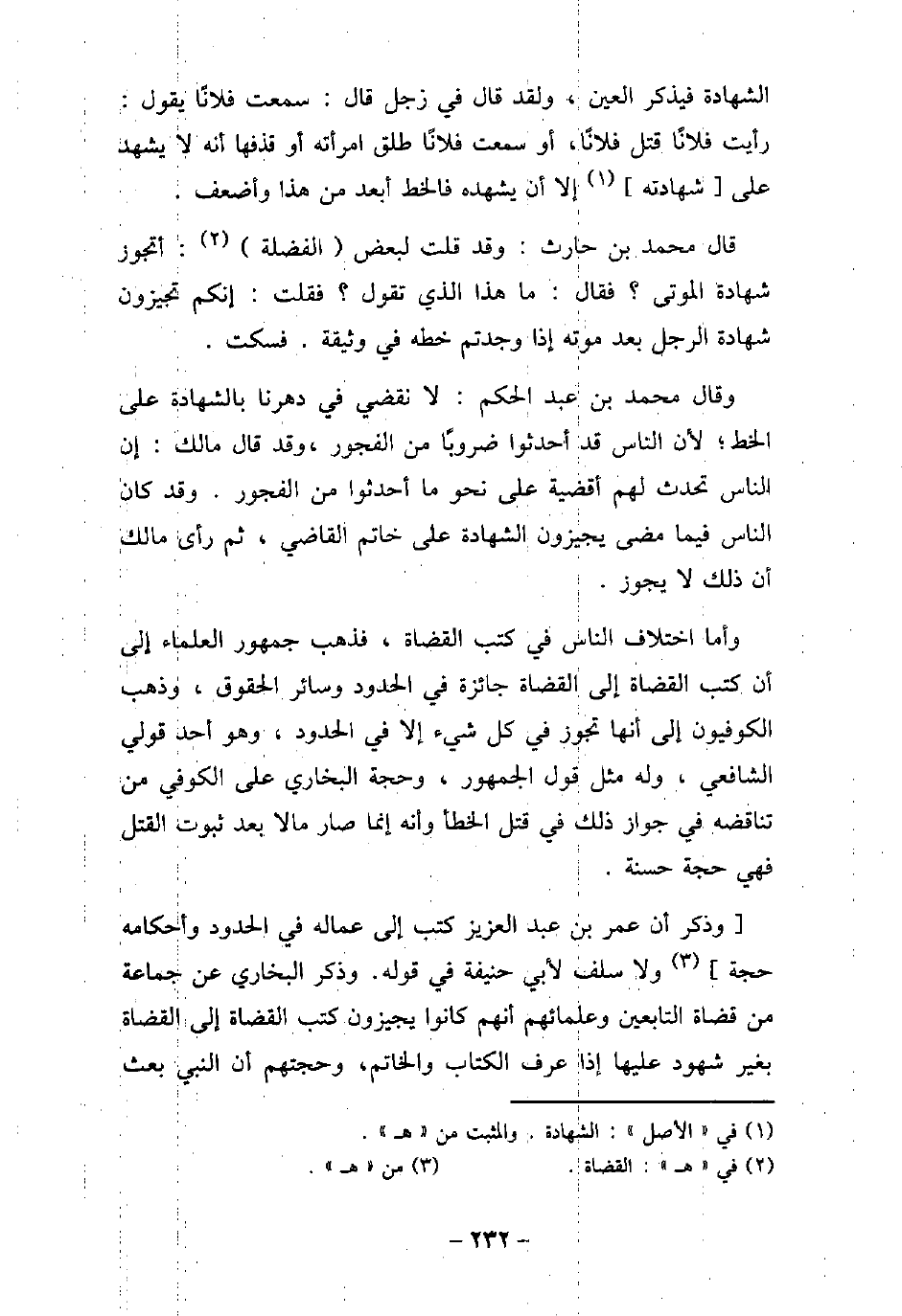الشهادة فيذكر العين، ولقد قال فى رجل قال: سمعت فلانًا يقول: رأيت فلانًا قتل فلانًا، أو سمعت فلانًا طلق امرأته أو قذفها أنه لا يشهد على شهادته إلا أن يشهده فالخط أبعد من هذا وأضعف. قال محمد بن حارث: وقد قلت لبعض الفضلة: أتجوز شهادة الموتى؟ فقال: ما هذا الذى تقول؟ فقلت: إنكم تجيزون شهادة الرجل بعد موته إذا وجدتم خطه فى وثيقة. فسكت. وقال محمد بن عبد الحكم: لا نقضى فى دهرنا بالشهادة على الخط؛ لأن الناس قد أحدثوا ضروبًا من الفجور، وقد قال مالك: إن الناس تحدث لهم أقضية على نحو ما أحدثوا من الفجور. وقد كان الناس فيما مضى يجيزون الشهادة على خاتم القاضى، ثم رأى مالك أن ذلك لا يجوز. وأما اختلاف الناس فى كتب القضاة، فذهب جمهور العلماء إلى أن كتب القضاة إلى القضاة جائزة فى الحدود، وسائر الحقوق، وذهب الكوفيون إلى أنها تجوز فى كل شىء إلا فى الحدود، وهو أحد قولى الشافعى، وله مثل قول الجمهور، وحجة البخارى على الكوفى من تناقضه فى جواز ذلك فى قتل الخطأ وأنه إنما صار مالا بعد ثبوت القتل فهى حجة حسنة. وذكر أن عمر بن عبد العزيز كتب إلى عماله فى الحدود وأحكامه حجة ولا سلف لأبى حنيفة فى قوله. وذكر البخارى عن جماعة من قضاة التابعين وعلمائهم أنهم كانوا يجيزون كتب القضاة إلى القضاة بغير شهود عليها إذا عرف الكتاب والخاتم، وحجتهم أن النبى (صلى الله عليه وسلم) بعث