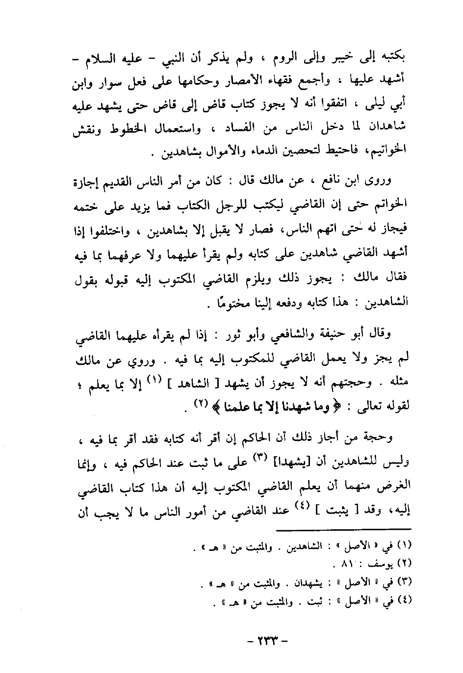 بكتبه إلى خيبر وإلى الروم، ولم يذكر أن النبى، عليه السلام، أشهد عليها. وأجمع فقهاء المصار وحكامها على فعل سوار وابن أبى ليلى، اتفقوا أنه لا يجوز كتاب قاض إلى قاض حتى يشهد عليه شاهدان لما دخل الناس من الفساد، واستعمال الخطوط ونقش الخواتيم، فاحتيط لتحصين الدماء والأموال بشاهدين. وروى ابن نافع، عن مالك قال: كان من أمر الناس القديم إجازة الخواتم حتى إن القاضى ليكتب للرجل الكتاب فما يزيد على ختمه فيجاز له حتى اتهم الناس، فصار لا يقبل إلا بشاهدين، واختلفوا إذا أشهد القاضى شاهدين على كتابه ولم يقرأ عليهما ولا عرفهما بما فيه فقال مالك: يجوز ذلك ويلزم القاضى المكتوب إليه قبوله بقول الشاهدين: هذا كتابه ودفعه إلينا مختومًا. وقال أبو حنيفة والشافعى وأبو ثور: إذا لم يقرأه عليهما القاضى لم يجز ولا يعمل القاضى للمكتوب إليه بما فيه. وروى عن مالك مثله. وحجتهم أنه لا يجوز أن يشهد الشاهد إلا بما يعلم؛ لقوله تعالى: (وما شهدنا إلا بما علمنا) [يوسف: 81] . وحجة من أجاز ذلك أن الحاكم إن أقر أنه كتابه فقد أقر بما فيه، وليس للشاهدين أن يشهدا على ما ثبت عند الحاكم فيه، وإنما الغرض منهما أن يعلم القاضى المكتوب إليه أن هذا كتاب القاضى إليه، وقد يثبت عند القاضى من أمور الناس ما لا يجب أن