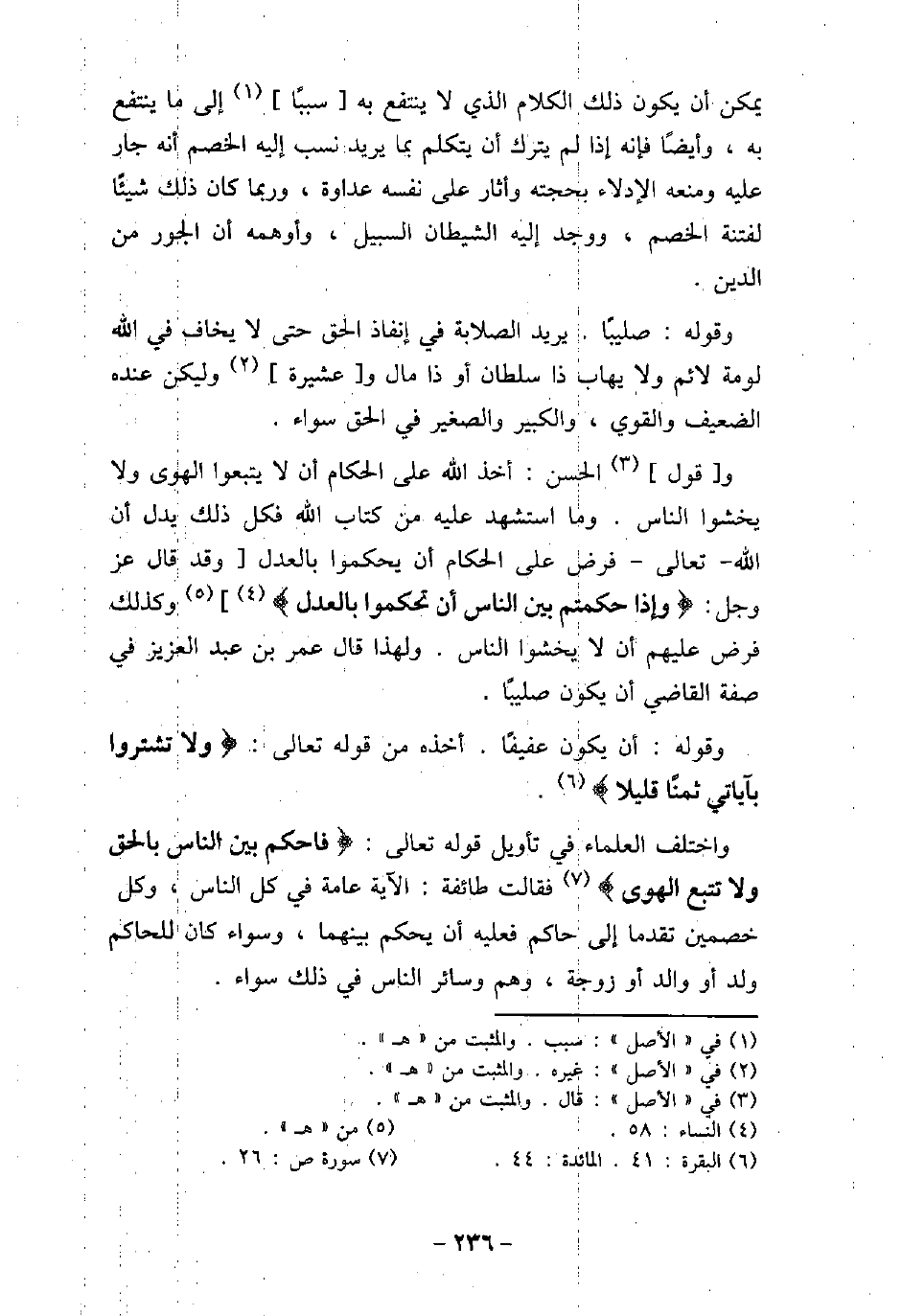 يمكن أن يكون ذلك الكلام الذى لا ينتفع به سببًا إلى ما ينتفع به، وأيضًا فإنه إذا لم يترك أن يتكلم بما يريد نسب إليه الخصم أنه جار عليه ومنعه الإدلاء بحجته وأثار على نفسه عداوة، وربما كان ذلك شيئًا لفتنة الخصم، ووجد إليه الشيطان السبيل، وأوهمه أن الجور من الدين. وقوله: صليبًا، يريد الصلابة فى إنفاذ الحق حتى لا يخاف فى الله لومة لائم ولا يهاب ذا سلطان أو ذا مال وعشيرة وليكن عنده الضعيف والقوى، والكبير والصغير فى الحق سواء. وقول الحسن: أخذ الله على الحكام أن لا يتبعوا الهوى ولا يخشوا الناس. وما استشهد عليه من كتاب الله فكل ذلك يدل أن الله تعالى فرض على الحكام أن يحكموا بالعدل، وقد قال عز وجل: (وإذا حكمتم بين الناس أن تحكموا بالعدل) [النساء: 85] ، وكذلك فرض عليهم أن لا يخشوا الناس. ولهذا قال عمر بن عبد العزيز فى صفة القاضى أن يكون صليبًا. وقوله: أن يكون عفيفًا. أخذه من قوله تعالى: (ولا تشتروا بآياتى ثمنًا قليلا) [البقرة: 41] . واختلف العلماء فى تأويل قوله تعالى: (فاحكم بين الناس بالحق ولا تتبع الهوى) [ص: 26] ، فقالت طائفة: الآية عامة فى كل الناس، وكل خصمين تقدما إلى حاكم فعليه أن يحكم بينهما، وسواء كان للحاكم ولد أو والد أو زوجة، وهم وسائر الناس فى ذلك سواء.