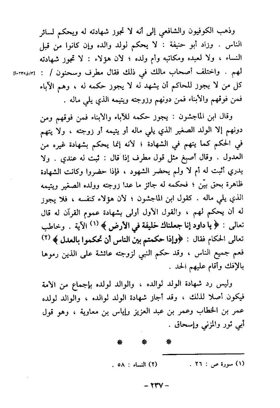 وذهب الكوفيون والشافعى إلى أنه لا تجوز شهادته له ويحكم لسائر الناس. وزاد أبو حنيفة: لا يحكم لولد والده وإن كانوا من قبل النساء، ولا لعبده وكاتبه وأم ولده؛ لأن هؤلاء: لا تجوز شهادته لهم. واحتلف أصحاب مالك فى ذلك فقال مطرف وسحنون: كل من لا يجوز للحاكم أن يشهد له لا يجوز حكمه له، وهم الآباء فمن فوقهم والأبناء فمن دونهم وزوجته ويتيمه الذى يلى ماله. وقال ابن الماجشون: يجوز حكمه للآباء والأبناء فمن فوقهم ومن دونهم إلا الولد الصغير الذى يلى ماله أو يتيمه أو زوجته، ولا يتهم فى الحكم كما يتهم فى الشهادة؛ لأنه إنما يحكم بشهادة غيره من العدول. وقال أصبغ مثل قول مطرف إذا قال: ثبت له عندى. ولا يدرى أثبت له أم لا ولم يحضر الشهود، فإذا حضروا وكانت الشهادة ظاهرة بحق بيّن؛ فحكمه له جائز ما عدا زوجته وولده الصغير ويتيمه الذى يلى ماله. كقول ابن الماجشون؛ لأن هؤلاء كنفسه، فلا يجوز له أن يحكم لهم، والقول الأول أولى بشهادة عموم القرآن له قال تعالى: (يا داود إنا جعلناك خليفة فى الأرض) [ص: 26] الآية. وخاطب تعالى الحكام فقال: (وإذا حكمتم بين الناس أن تحكموا بالعدل) [النساء: 58] فعم جميع الناس، وقد حكم النبى (صلى الله عليه وسلم) لزوجته عائشة على الذين رموها بالإفك وأقام عليهم الحد. وليس رد شهادة الولد لوالده، والوالد لولده بإجماع من الأمة فيكون أصلا لذلك، وقد أجاز شهادة الولد لوالده، والوالد لولده عمر بن الخطاب وعمر بن عبد العزيز وإياس بن معاوية، وهو قول أبى ثور والمزنى وإسحاق.