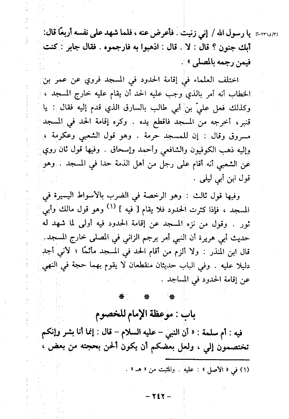 يَا رَسُولَ اللَّهِ، إِنِّى زَنَيْتُ، فَأَعْرَضَ عَنْهُ، فَلَمَّا شَهِدَ عَلَى نَفْسِهِ أَرْبَعًا، قَالَ: أَبِكَ جُنُونٌ؟ قَالَ: لا، قَالَ: اذْهَبُوا بِهِ فَارْجُمُوهُ) . فَقَالَ جَابِرَ: كُنْتُ فِيمَنْ رَجَمَهُ بِالْمُصَلَّى اختلف العلماء فى إقامة الحدود فى المسجد فروى عن عمر بن الخطاب أنه أمر بالذى وجب عليه الحد أن يقام عليه خارج المسجد، وكذلك فعل علىّ بن أبى طالب بالسارق الذى قدم إليه فقال: يا قنبر، أخرجه من المسجد فاقطع يده. وكره إقامة الحد فى المسجد مسروق وقال: إن للمسجد حرمة. وهو قول الشعبى وعكرمة، وإليه ذهب الكوفيون والشافعى وأحمد وإسحاق. وفيها قول ثان روى عن الشعبى أنه أقام على رجل من أهل الذمة حدا فى المسجد. وهو قول ابن أبى ليلى. وفيها قول ثالث: وهو الرخصة فى الضرب بالأسواط اليسيرة فى المسجد، فإذا كثرت الحدود فلا يقام فيه وهو قول مالك وأبى ثور. وقول من نزه المسجد عن إقامة الحدود فيه أولى لما شهد له حديث أبى هريرة أن النبى (صلى الله عليه وسلم) أمر برجم الزانى فى المصلى خارج المسجد. قال ابن المنذر: ولا ألزم من أقام الحد فى المسجد مأثمًا؛ لأنى أجد دليلا عليه. وفى الباب حديثان منقطعان لا يقوم بهما حجة فى النهى عن إقامة الحدود فى المساجد.