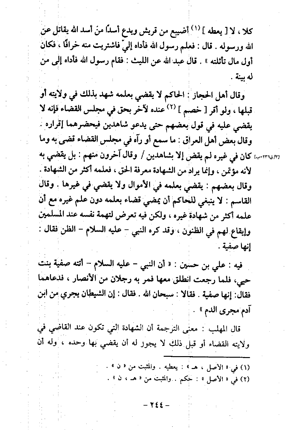 كَلا، لا يُعْطِهِ أُصَيْبِغَ مِنْ قُرَيْشٍ، وَيَدَعَ أَسَدًا مِنْ أُسْدِ اللَّهِ يُقَاتِلُ عَنِ اللَّهِ وَرَسُولِهِ، قَالَ: فَأَمَرَ رَسُولُ اللَّهِ (صلى الله عليه وسلم) ، فَأَدَّاهُ إِلَىَّ، فَاشْتَرَيْتُ مِنْهُ خِرَافًا، فَكَانَ أَوَّلَ مَالٍ تَأَثَّلْتُهُ) . قَالَ عَبْدُاللَّهِ، عَنِ اللَّيْثِ: فَقَامَ النَّبِىُّ (صلى الله عليه وسلم) فَأَدَّاهُ إِلَى مَنْ لَهُ بَيِّنَةٍ، وَقَالَ أَهْلُ الْحِجَازِ: الْحَاكِمُ لا يَقْضِى بِعِلْمِهِ شَهِدَ بِذَلِكَ فِى وِلايَتِهِ أَوْ قَبْلَهَا، وَلَوْ أَقَرَّ خَصْمٌ عِنْدَهُ لآخَرَ بِحَقٍّ فِى مَجْلِسِ الْقَضَاءِ، فَإِنَّهُ لا يَقْضِى عَلَيْهِ فِى قَوْلِ بَعْضِهِمْ حَتَّى يَدْعُوَ بِشَاهِدَيْنِ فَيُحْضِرَهُمَا إِقْرَارَهُ، وَقَالَ بَعْضُ أَهْلِ الْعِرَاقِ: مَا سَمِعَ أَوْ رَآهُ فِى مَجْلِسِ الْقَضَاءِ قَضَى بِهِ، وَمَا كَانَ فِى غَيْرِهِ لَمْ يَقْضِ إِلا بِشَاهِدَيْنِ، وَقَالَ آخَرُونَ مِنْهُمْ بَلْ يَقْضِى بِهِ؛ لأنَّهُ مُؤْتَمَنٌ وَإِنَّمَا يُرَادُ مِنَ الشَّهَادَةِ مَعْرِفَةُ الْحَقِّ، فَعِلْمُهُ أَكْثَرُ مِنَ الشَّهَادَةِ، وَقَالَ بَعْضُهُمْ: يَقْضِى بِعِلْمِهِ فِى الأمْوَالِ، وَلا يَقْضِى فِى غَيْرِهَا. وَقَالَ الْقَاسِمُ: لا يَنْبَغِى لِلْحَاكِمِ أَنْ يُمْضِىَ قَضَاءً بِعِلْمِهِ دُونَ عِلْمِ غَيْرِهِ مَعَ أَنَّ عِلْمَهُ أَكْثَرُ مِنْ شَهَادَةِ غَيْرِهِ، وَلَكِنَّ فِيهِ تَعَرُّضًا لِتُهَمَةِ نَفْسِهِ عِنْدَ الْمُسْلِمِينَ، وَإِيقَاعًا لَهُمْ فِى الظُّنُونِ، وَقَدْ كَرِهَ النَّبِىُّ (صلى الله عليه وسلم) الظَّنَّ فَقَالَ: إِنَّمَا هَذِهِ صَفِيَّةُ. / 30 - فيه: عَلِىِّ بْنِ حُسَيْنٍ (أَنَّ النَّبِىَّ (صلى الله عليه وسلم) أَتَتْهُ صَفِيَّةُ بِنْتُ حُيَىٍّ، فَلَمَّا رَجَعَتِ انْطَلَقَ مَعَهَا، فَمَرَّ بِهِ رَجُلانِ مِنَ الأنْصَارِ، فَدَعَاهُمَا، فَقَالَ: إِنَّمَا هِىَ صَفِيَّةُ، قَالا: سُبْحَانَ اللَّهِ، قَالَ: إِنَّ الشَّيْطَانَ يَجْرِى مِنِ ابْنِ آدَمَ مَجْرَى الدَّمِ) . قال المهلب: معنى الترجمة أن الشهادة التى تكون عند القاضى فى ولايته القضاء أو قبل ذلك لا يجوز له أن يقضى بها وحده، وله أن