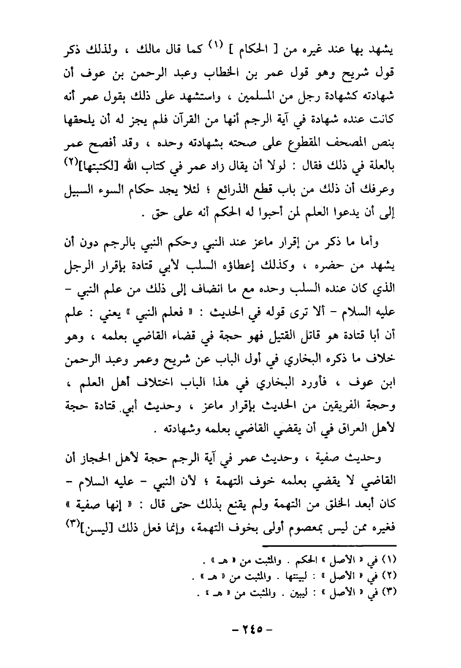 يشهد بها عند غيره من الحكام كما قال مالك، ولذلك ذكر قول شريح وهو قول عمر بن الخطاب وعبد الرحمن بن عوف أن شهادته كشهادة رجل من المسلمين، واستشهد على ذلك بقول عمر أنه كانت عنده شهادة فى آية الرجم أنها من القرآن فلم يجز له أن يلحقها بنص المصحف المقطوع على صحته بشهادته وحده، وقد أفصح عمر بالعلة فى ذلك فقال: لولا أن يقال زاد عمر فى كتاب الله لكتبتها وعرفك أن ذلك من باب قطع الذرائع؛ لئلا يجد حكام السوء السبيل إلى أن يدعوا العلم لمن أحبوا له الحكم أنه على حق. وأما ما ذكر من إقرار ماعز عند النبى (صلى الله عليه وسلم) وحكم النبى (صلى الله عليه وسلم) بالرجم دون أن يشهد من حضره، وكذلك إعطاؤه السلب لأبى قتادة بإقرار الرجل الذى كان عنده السلب وحده مع ما انضاف إلى ذلك من علم النبى (صلى الله عليه وسلم) ألا ترى قوله فى الحديث: (فعلم النبى (صلى الله عليه وسلم)) يعنى: علم أن أبا قتادة هو قاتل القتيل فهو حجة فى قضاء القاضى بعلمه، وهو خلاف ما ذكره البخارى فى أول الباب عن شريح وعمر وعبد الرحمن ابن عوف، فأورد البخارى فى هذا الباب اختلاف أهل العلم، وحجة الفريقين من الحديث بإقرار ماعز، وحديث أبى قتادة حجة لأهل العراق فى أن يقضى القاضى بعلمه وشهادته. وحديث صفية، وحديث عمر فى آية الرجم حجة لأهل الحجاز أن القاضى لا يقضى بعلمه خوف التهمة؛ لأن النبى (صلى الله عليه وسلم) كان أبعد الخلق من التهمة ولم يقنع بذلك حتى قال: (إنها صفية) فغيره ممن ليس بمعصوم أولى بخوف التهمة، وإنما فعل ذلك ليسن