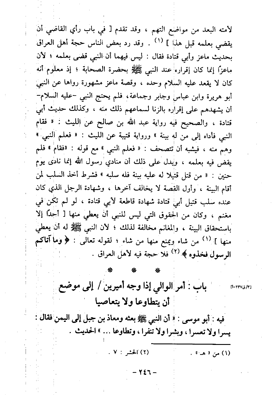 لأمته البعد من مواضع التهم، وقد تقدم فى باب رأى القاضى أن يقضى بعلمه قبل هذا. وقد رد بعض الناس حجة أهل العراق بحديث ماعز وأبى قتادة فقال: ليس فيهما أن النبى (صلى الله عليه وسلم) قضى بعلمه؛ لأن ماعزًا إنما كان إقراره عند النبى (صلى الله عليه وسلم) بحضرة الصحابة؛ إذ معلوم أنه كان لا يقعد (صلى الله عليه وسلم) وحده، وقصة ماعز مشهورة رواها عن النبى (صلى الله عليه وسلم) أبو هريرة وابن عباس وجابر وجماعة، فلم يحتج النبى (صلى الله عليه وسلم) أن يشهدهم على إقراره بالزنا لسماعهم ذلك منه، وكذلك حديث أبى قتادة، والصحيح فيه رواية عبد الله بن صالح عن الليث: (فقام النبى (صلى الله عليه وسلم) فأداه إلى من له بينة) ورواية قتيبة عن الليث: (فعلم النبى (صلى الله عليه وسلم)) وهم منه، فيشبه أن تتصحف: (فعلم النبى (صلى الله عليه وسلم)) مع قوله: (فقام) فلم يقض فيه بعلمه، ويدل على ذلك أن منادى رسول الله (صلى الله عليه وسلم) إنما نادى يوم حنين: (من قتل قتيلا له عليه بينة فله سلبه) فشرط أخذ السلب لمن أقام البينة، وأول القصة لا يخالف آخرها، وشهادة الرجل الذى كان عنده سلب قتيل أبى قتادة شهادة قاطعة لأبى قتادة، لو لم تكن فى مغنم، وكان من الحقوق التى ليس للنبى أن يعطى منها أحدًا إلا باستحقاق البينة، والمغانم مخالفة لذلك؛ لأن النبى (صلى الله عليه وسلم) له أن يعطى منها من شاء ويمنع منها من شاء؛ لقوله تعالى: (وما آتاكم الرسول فخذوه) [الحشر: 7] فلا حجة فيه لأهل العراق.