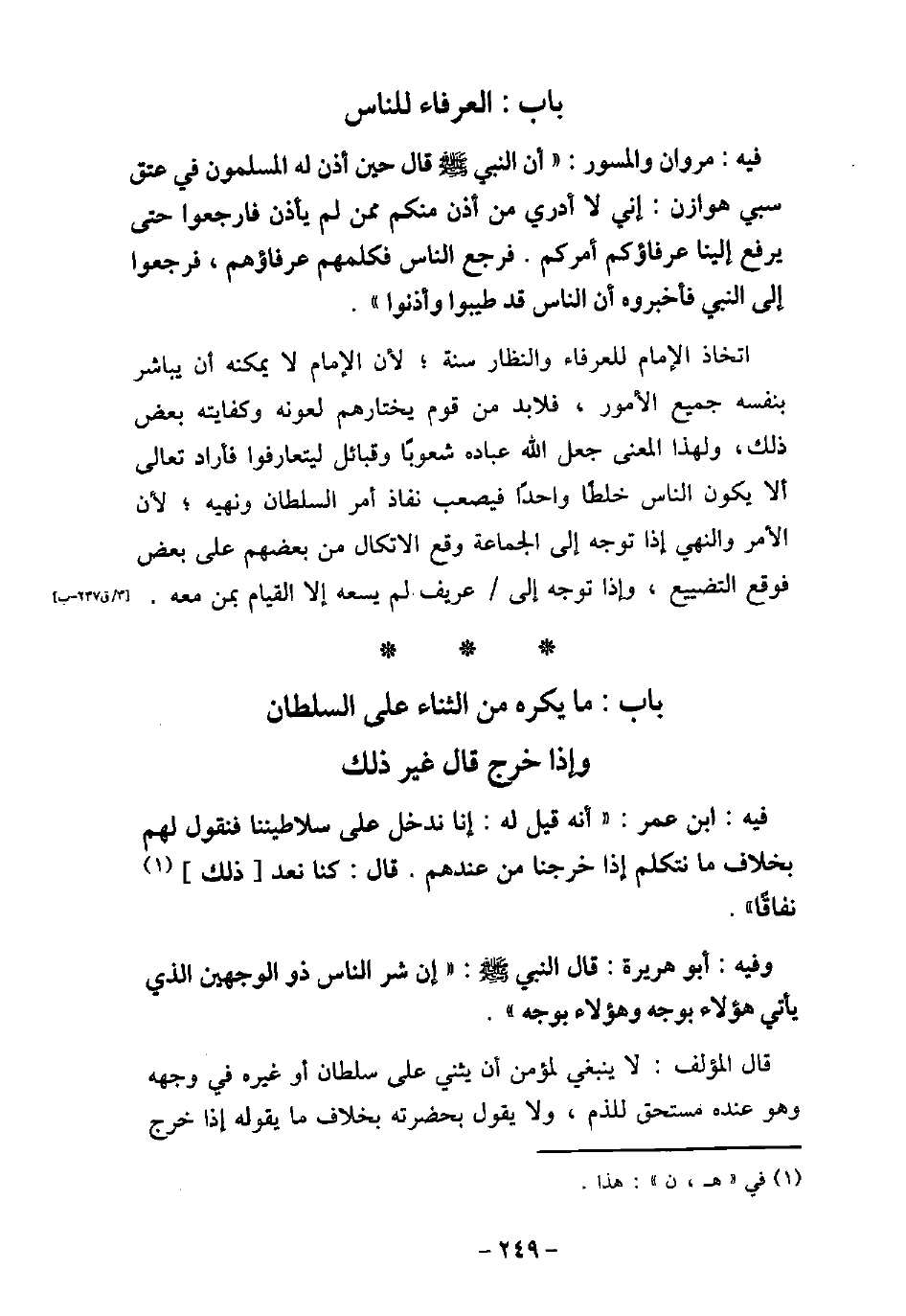 / 35 - فيه: مَرْوَانَ، وَالْمِسْوَرَ (أَنَّ النبى (صلى الله عليه وسلم) قَالَ حِينَ أَذِنَ لَهُمُ الْمُسْلِمُونَ فِى عِتْقِ سَبْىِ هَوَازِنَ: إِنِّى لا أَدْرِى مَنْ أَذِنَ مِنْكُمْ مِمَّنْ لَمْ يَأْذَنْ، فَارْجِعُوا حَتَّى يَرْفَعَ إِلَيْنَا عُرَفَاؤُكُمْ أَمْرَكُمْ، فَرَجَعَ النَّاسُ فَكَلَّمَهُمْ عُرَفَاؤُهُمْ، فَرَجَعُوا إِلَى رَسُولِ اللَّهِ (صلى الله عليه وسلم) فَأَخْبَرُوهُ، أَنَّ النَّاسَ قَدْ طَيَّبُوا وَأَذِنُوا) . اتخاذ الإمام للعرفاء والنظار سنة؛ لأن الإمام لا يمكنه أن يباشر بنفسه جميع الأمور، فلابد من قوم يختارهم لعونه وكفايته بعض ذلك، ولهذا المعنى جعل الله عباده شعوبًا وقبائل ليتعارفوا فأراد تعالى ألا يكون الناس خلطًا واحدًا فيصعب نفاذ أمر السلطان ونهيه؛ لأن الأمر والنهى إذا توجه إلى الجماعة وقع الاتكال من بعضهم على بعض فوقع التضييع، وإذا توجه إلى عريف لم يسعه إلا القيام بمن معه.