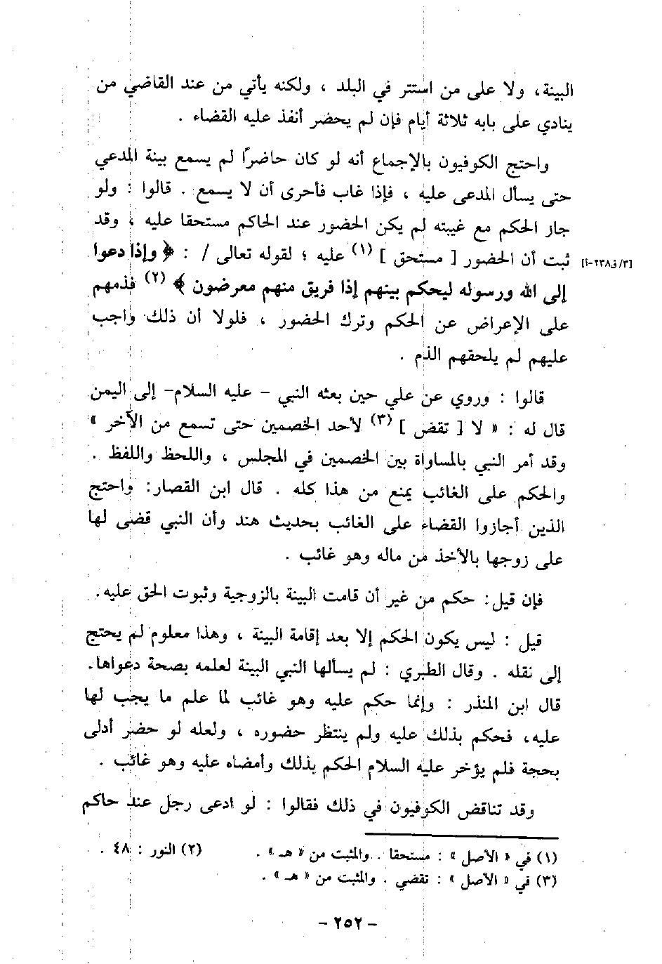 البينة، ولا على من استتر فى البلد، ولكنه يأتى من عند القاضى من ينادى على بابه ثلاثة أيام فإن لم يحضر أنفذ عليه القضاء. واحتج الكوفيون بالإجماع أنه لو كان حاضرًا لم يسمع بينة المدعى حتى يسأل المدعى إليه، فإذا غاب فأحرى أن لا يسمع. قالوا: ولو جاز الحكم مع غيبته لم يكن الحضور عند الحاكم مستحقا عليه، وقد ثبت أن الحضور مستحق عليه؛ لقوله تعالى: (وإذا دعوا إلى الله ورسوله ليحكم بينهم إذا فريق منهم معرضون) [النور: 48] فذمهم على الإعراض عن الحكم وترك الحضور، فلولا أن ذلك واجب عليهم لم يلحقهم الذم. قالوا: وروى عن على حين بعثه النبى (صلى الله عليه وسلم) إلى اليمن قال له: (لا تقض لأحد الخصمين حتى تسمع من الآخر) وقد أمر النبى (صلى الله عليه وسلم) بالمساواة بين الخصمين فى المجلس، واللحظ واللفظ. والحكم على الغائب يمنع من هذا كله. قال ابن القصار: واحتج الذين أجازوا القضاء على الغائب بحديث هند وأن النبى (صلى الله عليه وسلم) قضى لها على زوجها بالأخذ من ماله وهو غائب. فإن قيل: حكم من غير أن قامت البينة بالزوجية وثبوت الحق عليه. قيل: ليس يكون الحكم بعد إقامة البينة، وهذا معلوم لم يحتج إلى نقله. وقال الطبرى: لم يسألها النبى (صلى الله عليه وسلم) البينة لعلمه بصحة دعواها. قال ابن المنذر: وإنما حكم عليه وهو غائب لما علم ما يجب لها عليه، فحكم بذلك عليه ولم ينتظر حضوره، ولعله لو حضر أدلى بحجة فلم يؤخر (صلى الله عليه وسلم) الحكم بذلك وأمضاه عليه وهو غائب. وقد تناقض الكوفيون فى ذلك فقالوا: لو ادعى رجل عند حاكم