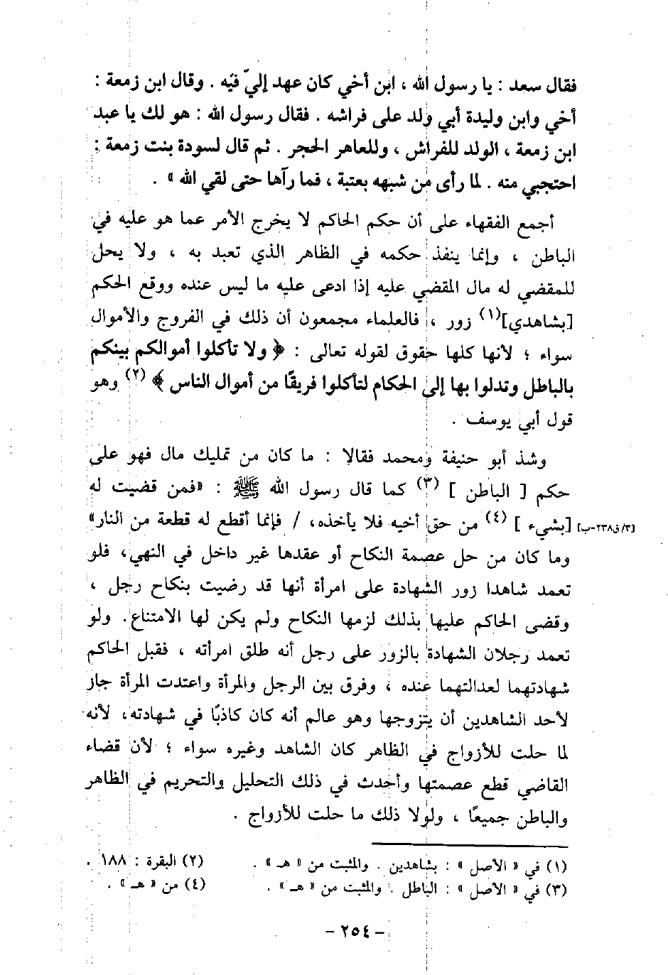 فَقَالَ سَعْدٌ: يَا رَسُولَ اللَّهِ، ابْنُ أَخِى، كَانَ عَهِدَ إِلَىَّ فِيهِ، وَقَالَ عَبْدُ بْنُ زَمْعَةَ: أَخِى وَابْنُ وَلِيدَةِ أَبِى وُلِدَ عَلَى فِرَاشِهِ، فَقَالَ رَسُولُ اللَّهِ (صلى الله عليه وسلم) : هُوَ لَكَ يَا عَبْدُ بْنَ زَمْعَةَ، ثُمَّ قَالَ رَسُولُ اللَّهِ (صلى الله عليه وسلم) : الْوَلَدُ لِلْفِرَاشِ، وَلِلْعَاهِرِ الْحَجَرُ، ثُمَّ قَالَ لِسَوْدَةَ بِنْتِ زَمْعَةَ: احْتَجِبِى مِنْهُ، لِمَا رَأَى مِنْ شَبَهِهِ بِعُتْبَةَ، فَمَا رَآهَا حَتَّى لَقِىَ اللَّهَ) . أجمع الفقهاء على أن حكم الحاكم لا يخرج الأمر عما هو عليه فى الباطن، وإنما ينفذ حكمه فى الظاهر الذى تعبد به، ولا يحل للمقضى له مال المقضى عليه إذا ادعى عليه ما ليس عنده ووقع الحكم بشاهدى زور، فالعلماء مجمعون أن ذلك فى الفروج والأموال سواء؛ لأنها كلها حقوق لقوله تعالى: (ولا تأكلوا أموالكم بينكم بالباطل وتدلوا بها إلى الحكام لتأكلوا فريقًا من أموال الناس) [البقرة: 188] وهو قول أبى يوسف. وشذ أبو حنيفة ومحمد فقالا: ما كان من تمليك مال فهو على حكم الباطن كما قال رسول الله (صلى الله عليه وسلم) : (فمن قضيت له بشىء من حق أخيه فلا يأخذه، فإنما أقطع له قطعة من النار) وما كان من حل عصمة النكاح أو عقدها غير داخل فى النهى، فلو تعمد شاهدا زور الشهادة على امرأة أنها قد رضيت بنكاح رجل، وقضى الحاكم عليها بذلك لزمها النكاح ولم يكن لها الامتناع. ولو تعمد رجلان الشهادة بالزور على رجل أنه طلق امرأته، فقبل الحاكم شهادتهما لعدالتهما عنده، وفرق بين الرجل والمرأة واعتدت المرأة جاز لأحد الشاهدين أن يتزوجها وهو عالم أنه كان كاذبًا فى شهادته، لأنه لما حلت للأزواج فى الظاهر كان الشاهد وغيره سواء؛ لأن قضاء القاضى قطع عصمتها وأحدث فى ذلك التحليل والتحريم فى الظاهر والباطن جميعًا، ولولا ذلك ما حلت للأزواج.