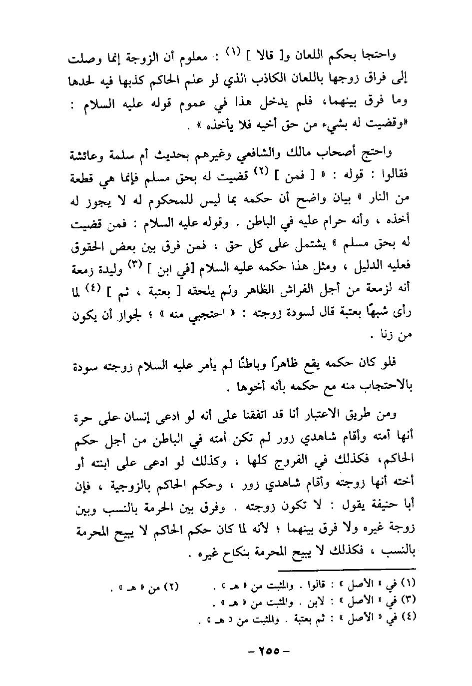 واحتجا بحكم اللعان وقالا: معلوم أن الزوجة إنما وصلت إلى فراق زوجها باللعان الكاذب الذى لو علم الحاكم كذبها فيه لحدها وما فرق بينهما، فلم يدخل هذا فى عموم قوله (صلى الله عليه وسلم) : (وقضيت له بشىء من حق أخيه فلا يأخذه) . واحتج أصحاب مالك والشافعى وغيرهم بحديث أم سلمة وعائشة فقالوا: قوله: (فمن قضيت له بحق مسلم فإنما هى قطعة من النار) بيان واضح أن حكمه بما ليس للمحكوم له لا يجوز له أخذه، وأنه حرام عليه فى الباطن. وقوله (صلى الله عليه وسلم) : (فمن قضيت له بحق مسلم) يشتمل على كل حق، فمن فرق بين بعض الحقوق فعليه الدليل، ومثل هذا حكمه (صلى الله عليه وسلم) فى ابن وليدة زمعة أنه لزمعة من أجل الفراش الظاهر ولم يلحقه بعتبة، ثم لما رأى شبهًا بعتبة قال لسودة زوجته: (احتجبى منه) ؛ لجواز أن يكون من زنا. فلو كان حكمه يقع ظاهرًا وباطنًا لم يأمر (صلى الله عليه وسلم) زوجته سودة بالاحتجاب منه مع حكمه بأنه أخوها. ومن طريق الاعتبار أنا قد اتفقا على أنه لو ادعى إنسان على حرة أنها أمته وأقام شاهدى زور لم تكن أمته فى الباطن من أجل حكم الحاكم، فكذلك فى الفروج كلها، وكذلك لو ادعى على ابنته أو أخته أنها زوجته وأقام شاهدى زور، وحكم الحاكم بالزوجية، فإن أبا حنيفة يقول: لا تكون زوجته. وفرق بين الحرمة بالنسب وبين زوجة غيره ولا فرق بينهما؛ لأنه لما كان حكم الحاكم لا يبيح المحرمة بالنسب، فكذلك لا يبيح المحرمة بنكاح غيره.