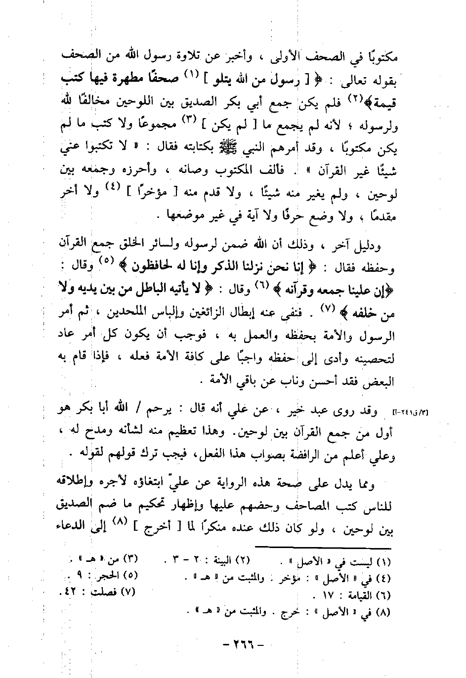 مكتوبًا فى الصحف الأولى، وأخبر عن تلاوة رسول الله (صلى الله عليه وسلم) من الصحف بقوله تعالى: (رسول من الله يتلو صحفًا مطهرة فيها كتب قيمة) [البينة: 2، 3] فلم يكن جمع أبى بكر الصديق بين اللوحين مخالفًا لله ولرسوله؛ لأنه لم يجمع ما لم يكن مجموعًا ولا كتب ما لم يكن مكتوبًا، وقد أمرهم النبى (صلى الله عليه وسلم) بكتابته فقال: (لا تكتبوا عنى شيئًا غير القرآن) . فألف المكتوب وصانه، وأحرزه وجمعه بين لوحين، ولم يغير منه شيئًا، ولا قدم منه مؤخرًا ولا أخر مقدمًا، ولا وضع حرفًا ولا آية فى غير موضعها. ودليل آخر، وذلك أن الله ضمن لرسوله ولسائر الخلق جمع القرآن وحفظه فقال: (إنا نحن نزلنا الذكر وإنا له لحافظون) [الحجر: 9] ، وقال: (إن علينا جمعه وقرآنه) [القيامة: 16] ، وقال: (لا يأتيه الباطل من بين يديه ولا من خلفه) [فصلت: 42] . فنفى عنه إبطال الزائغين وإلباس الملحدين، ثم أمر الرسول والأمة بحفظه والعمل به، فوجب أن يكون كل أمر عاد لتحصينه وأدى إلى حفظه واجبًا على كافة الأمة فعله، فإذا قام به البعض فقد أحسن وناب عن باقى الأمة. وقد روى عبد خير، عن على أنه قال: يرحم الله أبا بكر هو أول من جمع القرآن بين لوحين. وهذا تعظيم منه لشأنه ومدح له، وعلى أعلم من الرافضة بصواب هذا الفعل، فيجب ترك قولهم لقوله. ومما يدل على صحة هذه الرواية عن علىّ ابتغاؤه لأجره وإطلاقه للناس كتب المصاحف وحضهم عليها وإظهار تحكيم ما ضم الصديق بين لوحين، ولو كان ذلك عنده منكرًا لما أخرج إلى الدعاء