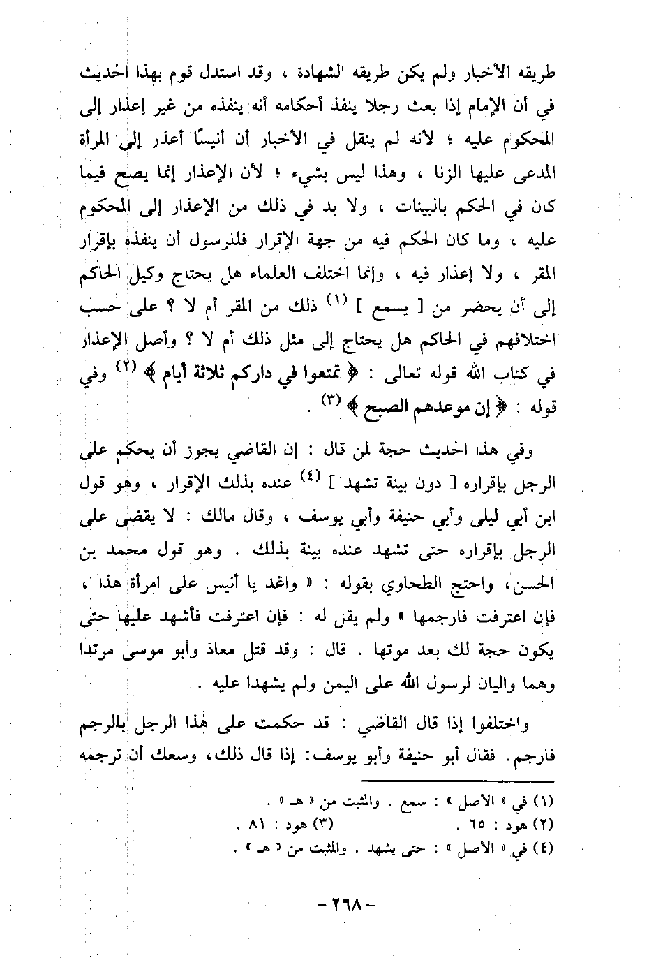 طريقه الأخبار ولم يكن طريقه الشهادة، وقد استدل قوم بهذا الحديث فى أن الإمام إذا بعث رجلا ينفذ أحكامه أنه ينفذه من غير إعذار إلى المحكوم عليه؛ لأنه لم ينقل فى الأخبار أن أنيسًا أعذر إلى المرأة المدعى عليها الزنا، وهذا ليس بشىء؛ لأن الإعذار إنما يصح فيما كان فى الحكم بالبينات، ولابد فى ذلك من الإعذار إلى المحكوم عليه، وما كان الحكم فيه من جهة الإقرار فللرسول أن ينفذه بإقرار المقر، ولا إعذار فيه، وإنما اختلف العلماء هل يحتاج وكيل الحاكم إلى أن يحضر من يسمع ذلك من المقر أم لا؟ على حسب اختلافهم فى الحاكم هل يحتاج إلى مثل ذلك أم لا؟ وأصل الإعذار فى كتاب الله قوله تعالى: (تمتعوا فى دراكم ثلاثة أيام) [هود: 65] وفى قوله: (إن موعدهم الصبح) [هود: 81] . وفى هذا الحديث حجة لمن قال: إن القاضى يجوز أن يحكم على الرجل بإقراره دون بينة تشهد عنده بذلك الإقرار، وهو قول ابن أبى ليلى وأبى حنيفة وأبى يوسف، وقال مالك: لا يقضى على الرجل بإقراره حتى تشهد عنده بينة بذلك. وهو قول محمد بن الحسن، واحتج الطحاوى بقوله: (واغد يا أنيس على امرأة هذا، فإن اعترفت فارجمها) ولم يقل له: فإن اعترفت فأشهد عليها حتى يكون حجة لك بعد موتها. قال: وقد قتل معاذ وأبو موسى مرتدا وهما واليان لرسول الله (صلى الله عليه وسلم) على اليمن ولم يشهدا عليه. واختلفوا إذا قال القاضى: قد حكمت على هذا الرجل بالرجم فارجم. فقال أبو حنيفة وأبو يوسف: إذا قال ذلك، وسعك أن ترجمه