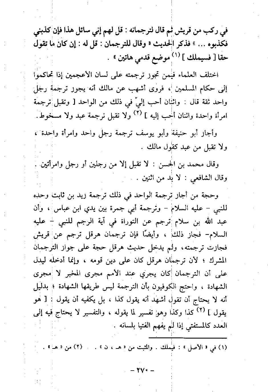 فِى رَكْبٍ مِنْ قُرَيْشٍ، ثُمَّ قَالَ لِتَرْجُمَانِهِ: قُلْ لَهُمْ إِنِّى سَائِلٌ هَذَا، فَإِنْ كَذَبَنِى فَكَذِّبُوهُ، فَذَكَرَ الْحَدِيثَ، فَقَالَ لِلتُّرْجُمَانِ، قُلْ لَهُ إِنْ كَانَ مَا تَقُولُ حَقًّا، فَسَيَمْلِكُ مَوْضِعَ قَدَمَىَّ هَاتَيْنِ. اختلف العلماء فيمن تجوز ترجمته على لسان الأعجمين إذا تحاكموا إلى حكام المسلمين، فروى أشهب عن مالك أنه يجوز ترجمة رجل واحد ثقة قال: واثنان أحب إلىّ فى ذلك من الواحد وتقبل ترجمة امرأة واحدة واثنان أحب إليه ولا تقبل ترجمة عبد ولا مسخوط. وأجاز أبو حنيفة وأبو يوسف ترجمة رجل واحد وامرأة واحدة، ولا تقبل من عبد كقول مالك. وقال محمد بن الحسن: لا تقبل إلا من رجلين أو رجل وامرأتين. وقال الشافعى: لابد من اثنين. وحجة من أجاز ترجمة الواحد فى ذلك ترجمة زيد بن ثابت وحده للنبى (صلى الله عليه وسلم) وترجمة أبى جمرة بين يدى ابن عباس، وأن عبد الله بن سلام ترجم عن التوراة فى آية الرجم للنبى (صلى الله عليه وسلم) فجاز ذلك، وأيضًا فإن ترجمان هرقل ترجم عن قريش فجازت ترجمته، ولم يدخل حديث هرقل حجة على جواز الترجمان المشرك؛ لأن ترجمان هرقل كان على دين قومه، وإنما أدخله ليدل على أن الترجمان كان يجرى عند الأمم مجرى المخبر لا مجرى الشهادة، واحتج الكوفيون بأن الترجمة ليس طريقها الشهادة؛ بدليل أنه لا يحتاج أن تقول أشهد أنه يقول كذا، بل يكفيه أن يقول: هو يقول كذا وكذا وهو تفسير لما يقوله، والتفسير لا يحتاج فيه إلى العدد كالمستفتى إذا لم يفهم الفتيا بلسانه.