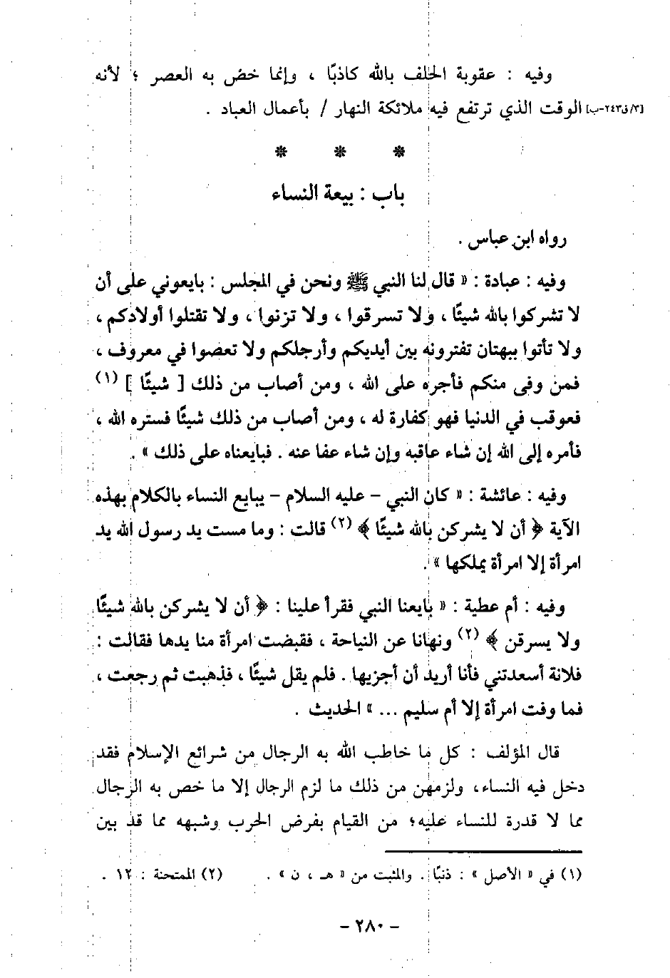 / 66 - وفيه: عُبَادَةَ، قَالَ لَنَا رَسُولُ اللَّهِ (صلى الله عليه وسلم) وَنَحْنُ فِى مَجْلِسٍ: تُبَايِعُونِى عَلَى أَنْ لا تُشْرِكُوا بِاللَّهِ شَيْئًا، وَلا تَسْرِقُوا، وَلا تَزْنُوا، وَلا تَقْتُلُوا أَوْلادَكُمْ، وَلا تَأْتُوا بِبُهْتَانٍ تَفْتَرُونَهُ بَيْنَ أَيْدِيكُمْ وَأَرْجُلِكُمْ، وَلا تَعْصُوا فِى مَعْرُوفٍ، فَمَنْ وَفَى مِنْكُمْ، فَأَجْرُهُ عَلَى اللَّهِ، وَمَنْ أَصَابَ مِنْ ذَلِكَ شَيْئًا، فَعُوقِبَ فِى الدُّنْيَا، فَهُوَ كَفَّارَةٌ لَهُ، وَمَنْ أَصَابَ مِنْ ذَلِكَ شَيْئًا، فَسَتَرَهُ اللَّهُ، فَأَمْرُهُ إِلَى اللَّهِ إِنْ شَاءَ عَاقَبَهُ، وَإِنْ شَاءَ عَفَا عَنْهُ، فَبَايَعْنَاهُ عَلَى ذَلِكَ) . / 67 - وفيه: عَائِشَةَ، كَانَ النَّبِىُّ (صلى الله عليه وسلم) يُبَايِعُ النِّسَاءَ بِالْكَلامِ بِهَذِهِ الآيَة: (أن لا يُشْرِكْنَ بِاللَّهِ شَيْئًا) [الممتحنة: 12] قَالَتْ: وَمَا مَسَّتْ يَدُ رَسُولِ اللَّهِ (صلى الله عليه وسلم) يَدَ امْرَأَةٍ، إِلا امْرَأَةً يَمْلِكُهَا. / 68 - وفيه: أُمِّ عَطِيَّةَ، بَايَعْنَا النَّبِىَّ (صلى الله عليه وسلم) فَقَرَأَ عَلَيْنَا: (أَنْ لا يُشْرِكْنَ بِاللَّهِ شَيْئًا وَلاَ يَسْرِقنَ) [الممتحنة: 12] ، وَنَهَانَا عَنِ النِّيَاحَةِ، فَقَبَضَتِ امْرَأَةٌ مِنَّا يَدَهَا، فَقَالَتْ: فُلانَةُ أَسْعَدَتْنِى، وَأَنَا أُرِيدُ أَنْ أَجْزِيَهَا، فَلَمْ يَقُلْ شَيْئًا، فَذَهَبَتْ ثُمَّ رَجَعَتْ فَمَا وَفَتِ امْرَأَةٌ إِلا أُمُّ سُلَيْمٍ. . . الحديث. قال المؤلف: كل ما خاطب الله بن الرجال من شرائع الإسلام فقد دخل فيه النساء، ولزمهن من ذلك ما لزم الرجال إلا ما خص به الرجال مما لا قدرة للنساء عليه؛ من القيام بفرض الحرب وشبهه مما قد بين