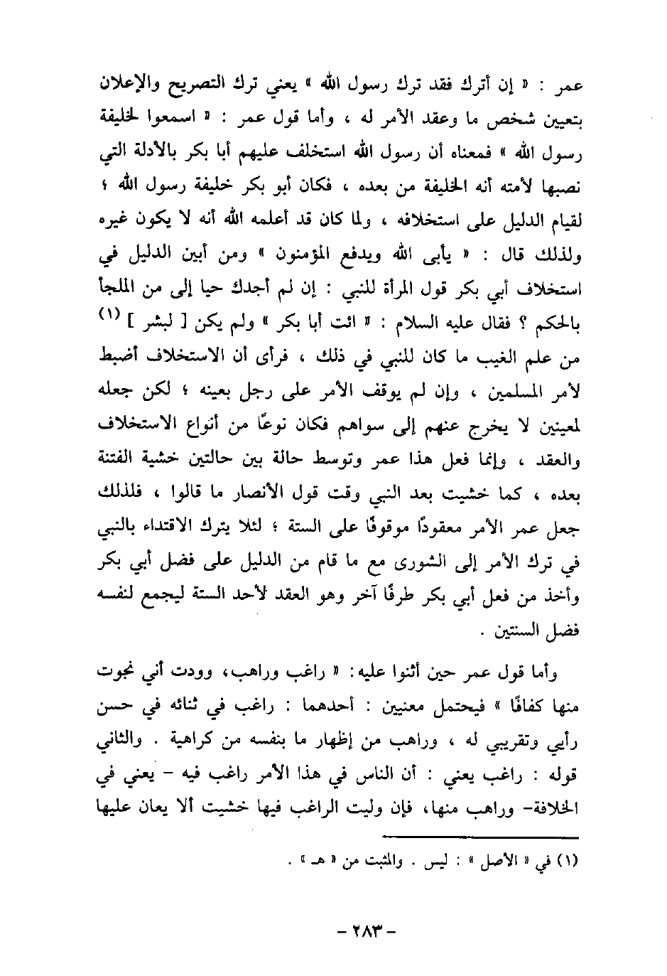 عمر: (إن أترك فقد ترك رسول الله (صلى الله عليه وسلم)) يعنى ترك التصريح والإعلان بتعيين شخص ما وعقد الأمر له، وأما قول عمر: (اسمعوا لخليفة رسول الله (صلى الله عليه وسلم)) فمعناه أن رسول الله (صلى الله عليه وسلم) استخلف عليهم أبا بكر بالأدلة التى نصبها لأمته أنه الخليفة من بعده، فكان أبو بكر خليفة رسول الله (صلى الله عليه وسلم) ؛ لقيام الدليل على استخلافه، ولما كان قد أعلمه الله أنه لا يكون غيره ولذلك قال: (يأبى الله ويدفع المؤمنون) ومن أبين الدليل فى استخلاف أبى بكر قول المرأة للنبى: إن لم أجدك حيا إلى من الملجأ بالحكم؟ فقال (صلى الله عليه وسلم) : (ائت أبا بكر) ولم يكن لبشر من علم الغيب ما كان للنبى (صلى الله عليه وسلم) فى ذلك، فرأى أن الاستخلاف أضبط لأمر المسلمين، وإن لم يوقف الأمر على رجل بعينه؛ لكن جعله لمعينين لا يخرج عنهم إلى سواهم فكان نوعًا من أنواع الاستخلاف والعقد، وإنما فعل هذا عمر وتوسط حالة بين حالتين خشية الفتنة بعده، كما خشيت بعد النبى (صلى الله عليه وسلم) وقت قول الأنصار ما قالوا، فلذلك جعل عمر الأمر معقودًا موقوفًا على الستة؛ لئلا يترك الاقتداء بالنبى (صلى الله عليه وسلم) فى ترك الأمر إلى الشورى مع ما قام من الدليل على فضل أبى بكر وأخذ من فعل أبى بكر طرفًا آخر وهو العقد لأحد الستة ليجمع لنفسه فضل السنتين. وأما قول عمر حين أثنوا عليه: (راغب وراهب، وودت أنى نجوت منها كفافًا) فيحتمل معنيين: أحدهما: راغب فى ثنائه فى حسن رأيى وتقريبى له، وراهب من إظهار ما بنفسه من كراهية. والثانى قوله: راغب يعنى: أن الناس فى هذا الأمر راغب فيه، يعنى فى الخلافة، وراهب منها، فإن وليت الراغب فيها خشيت ألا يعان عليها