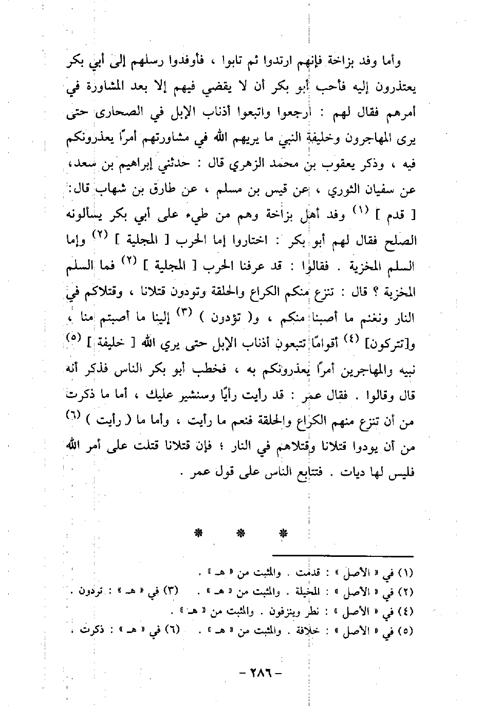 فلان: خلفنى. وأما وفد بزاخة فإنهم ارتدوا ثم تابوا. فأوفدوا رسلهم إلى أبى بكر يعتذرون إليه فأحب أبو بكر أن لا يقضى فيهم إلا بعد المشاورة فى أمرهم فقال لهم: ارجعوا واتبعوا أذناب الإبل فى الصحارى حتى يرى المهاجرون وخليفة النبى (صلى الله عليه وسلم) ما يريهم الله فى مشاورتهم أمرًا يعذرونكم فيه، وذكر يعقوب بن محمد الزهرى قال: حدثنى إبراهيم بن سعد، عن سفيان الثورى، عن قيس بن مسلم، عن طارق بن شهاب قال: قدم وفد أهل بزاخة وهم من طئ على أبى بكر يسألونه الصلح فقال لهم أبو بكر: اختاروا إما الحرب المجلية وإما السلم المخزية. فقالوا: قد عرفنا الحرب المجلية فما السلم المخزية؟ قال: تنزع منكم الكراع والحلقة وتودون قتلانا، وقتلاكم فى النار ونغنم ما أصبنا منكم، وتؤدون إلينا ما أصبتم منا، وتتركون أقوامًا تتبعون أذناب الإبل حتى يرى الله خليفة نبيه والمهاجرين أمرًا يعذرونكم به، فخطب أبو بكر الناس فذكر أنه قال وقالوا. فقال عمر: قد رأيت رأيًا وسنشير عليك، أما ما ذكرت من أن تنزع منهم الكراع والحلقة فنعم ما رأيت، وأما ما رأيت من أن يودوا قتلانا وقتلاهم فى النار؛ فإن قتلانا قتلت على أمر الله فليس لها ديات. فتتابع الناس على قول عمر.