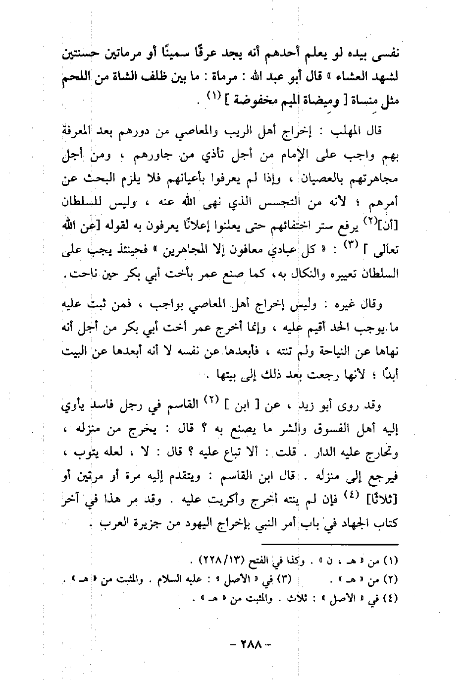 نَفْسِى بِيَدِهِ، لَوْ يَعْلَمُ أَحَدُكُمْ أَنَّهُ يَجِدُ عَرْقًا سَمِينًا أَوْ مِرْمَاتَيْنِ حَسَنَتَيْنِ لَشَهِدَ الْعِشَاءَ) . قال أبو عبد الله: مرماة: ما بين ظلف الشاة من اللحم مثل مِنساة ومِيضاة الميم مخفوضة. قال المهلب: إخراج أهل الريب والمعاصى من دورهم بعد المعرفة بهم واجب على الإمام من أجل تأذى من جاورهم، ومن أجل مجاهرتهم بالعصيان، وإذا لم يعرفوا بأعيانهم فلا يلزم البحث عن أمرهم؛ لأنه من التجسس الذى نهى الله عنه، وليس للسلطان أن يرفع ستر اختفائهم حتى يعلنوا إعلانًا يعرفون به لقوله (صلى الله عليه وسلم) عن الله تعالى: (كل عبادى معافون إلا المجاهرين) فحينئذ يجب على السلطان تعييره والنكال به، كما صنع عمر بأخت أبى بكر حين ناحت. وقال غيره: وليس إخراج أهل المعاصى بواجب، فمن ثبت عليه ما يوجب الحد أقيم عليه، وإنما أخرج عمر أخت أبى بكر من أجل أنه نهاها عن النياحة ولم تنته، فأبعدها عن نفسه لا أنه أبعدها عن البيت أبدًا؛ لأنها رجعت بعد ذلك إلى بيتها. وقد روى أبو زيد، عن ابن القاسم فى رجل فاسد يأوى إليه أهل الفسوق والشر ما يصنع به؟ قال: يخرج من منزله، وتحارج عليه الدار. قلت: ألا تباع عليه؟ قال: لا، لعله يتوب، فيرجع إلى منزله. قال ابن القاسم: ويتقدم إليه مرة أو مرتين أو ثلاثًا فإن لم ينته أخرج وأكريت عليه. وقد مر هذا فى آخر كتاب الجهاد فى باب أمر النبى (صلى الله عليه وسلم) بإخراج اليهود من جزيرة العرب.