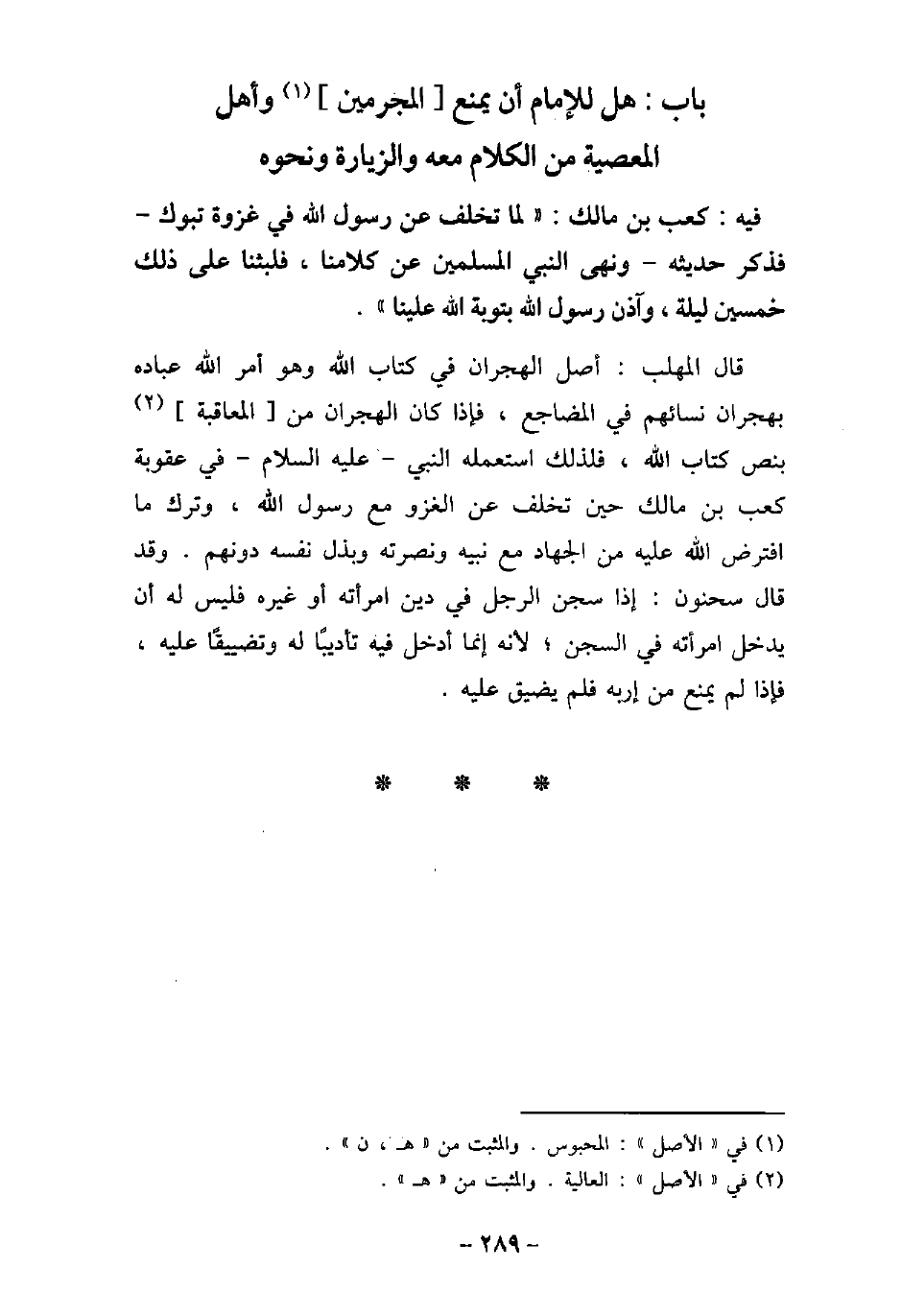 / 76 - فيه: كَعْبِ بْنِ مَالِكٍ، لَمَّا تَخَلَّفَ عَنْ رَسُولِ اللَّهِ (صلى الله عليه وسلم) فِى غَزْوَةِ تَبُوكَ، فَذَكَرَ حَدِيثَهُ وَنَهَى النَّبىُّ (صلى الله عليه وسلم) الْمُسْلِمِينَ عَنْ كَلامِنَا، فَلَبِثْنَا عَلَى ذَلِكَ خَمْسِينَ لَيْلَةً، وَآذَنَ رَسُولُ اللَّهِ (صلى الله عليه وسلم) بِتَوْبَةِ اللَّهِ عَلَيْنَا. قال المهلب: أصل الهجران فى كتاب الله وهو أمر الله عباده بهجران نسائهم فى المضاجع، فإذا كان الهجران من المعاقبة بنص كتاب الله، فلذلك استعمله النبى (صلى الله عليه وسلم) فى عقوبة كعب بن مالك حين تخلف عن الغزو مع رسول الله (صلى الله عليه وسلم) ، وترك ما افترض الله عليه من الجهاد مع نبيه ونصرته وبذل نفسه دونهم. وقد قال سحنون: إذا سجن الرجل فى دين امرأته أو غيره فليس له أن يدخل امرأته فى السجن؛ لأنه إنما أدخل فيه تأديبًا له وتضييقًا عليه، فإذا لم يمنع من إربه فلم يضيق عليه.