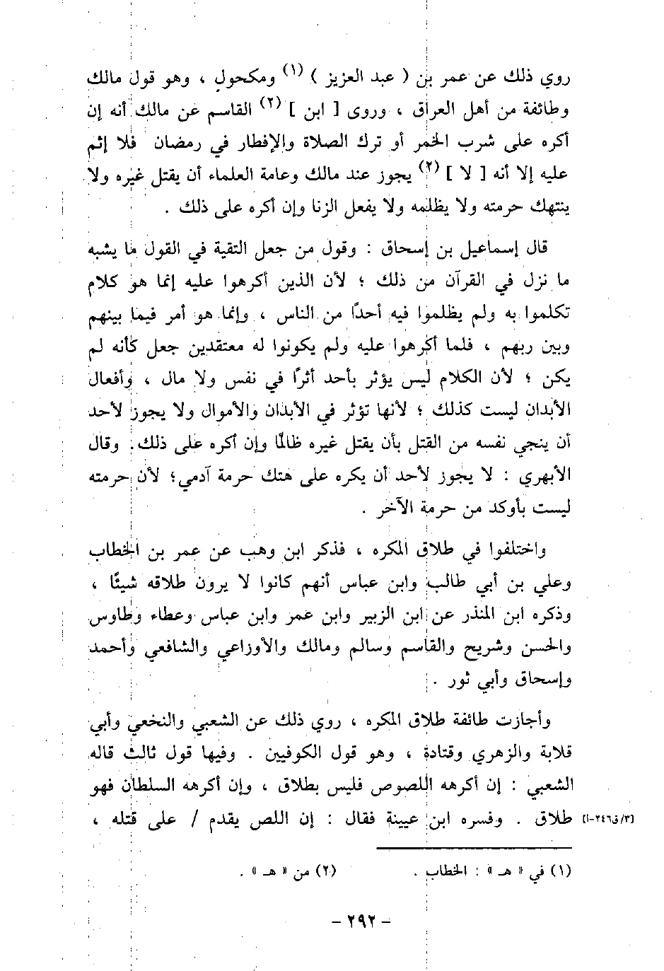 روى ذلك عن عمر بن عبد العزيز ومكحول، وهو قول مالك وطائفة من أهل العراق، وروى ابن القاسم عن مالك أنه إن أكره على شرب الخمر أو ترك الصلاة والإفطار فى رمضان فلا إثم عليه إلا أنه لا يجوز عند مالك وعامة العلماء أن يقتل غيره ولا ينتهك حرمته ولا يظلمه ولا يفعل الزنا وإن كره على ذلك. قال إسماعيل بن إسحاق: وقول من جعل التقية فى القول ما يشبه ما نزل فى القرآن من ذلك؛ لأن الذين أكرهوا عليه إنما هو كلام تكلموا به ولم يظلموا فيه أحدًا من الناس، وإنما هو أمر فيما بينهم وبين ربهم، فلما أكرهوا عليه ولم يكونوا له معتقدين جعل كأنه لم يكن؛ لأن الكلام ليس يؤثر بأحد أثرًا فى نفس ولا مال، وأفعال الأبدان ليست كذلك؛ لأنها تؤثر فى الأبدان والأموال ولا يجوز لأحد أن ينجى نفسه من القتل بأن يقتل غيره ظالمًا وإن أكره على ذلك. وقال الأبهرى: لا يجوز لأحد أن يكره على هتك حرمة آدمى؛ لأن حرمته ليست بأوكد من حرمة الآخر. واختلفوا فى طلاق المكره، فذكر ابن وهب عن عمر بن الخطاب وعلى بن أبى طالب وابن عباس أنهم كانوا لا يرون طلاقه شيئًا، وذكره ابن المنذر عن ابن الزبير وابن عمر وابن عباس وعطاء وطاوس والحسن وشريح والقاسم وسالم ومالك والأوزاعى والشافعى وأحمد وإسحاق وأبى ثور. وأجازت طائفة طلاق المكره، روى ذلك عن الشافعى والنخعى وأبى قلابة والزهرى وقتادة، وهو قول الكوفيين. وفيها قول ثالث قاله الشعبى: إن أكرهه اللصوص فليس بطلاق، وإن أكرهه السلطان فهو طلاق. وفسره ابن عيينة فقال: إن اللص يقدم على قتله،